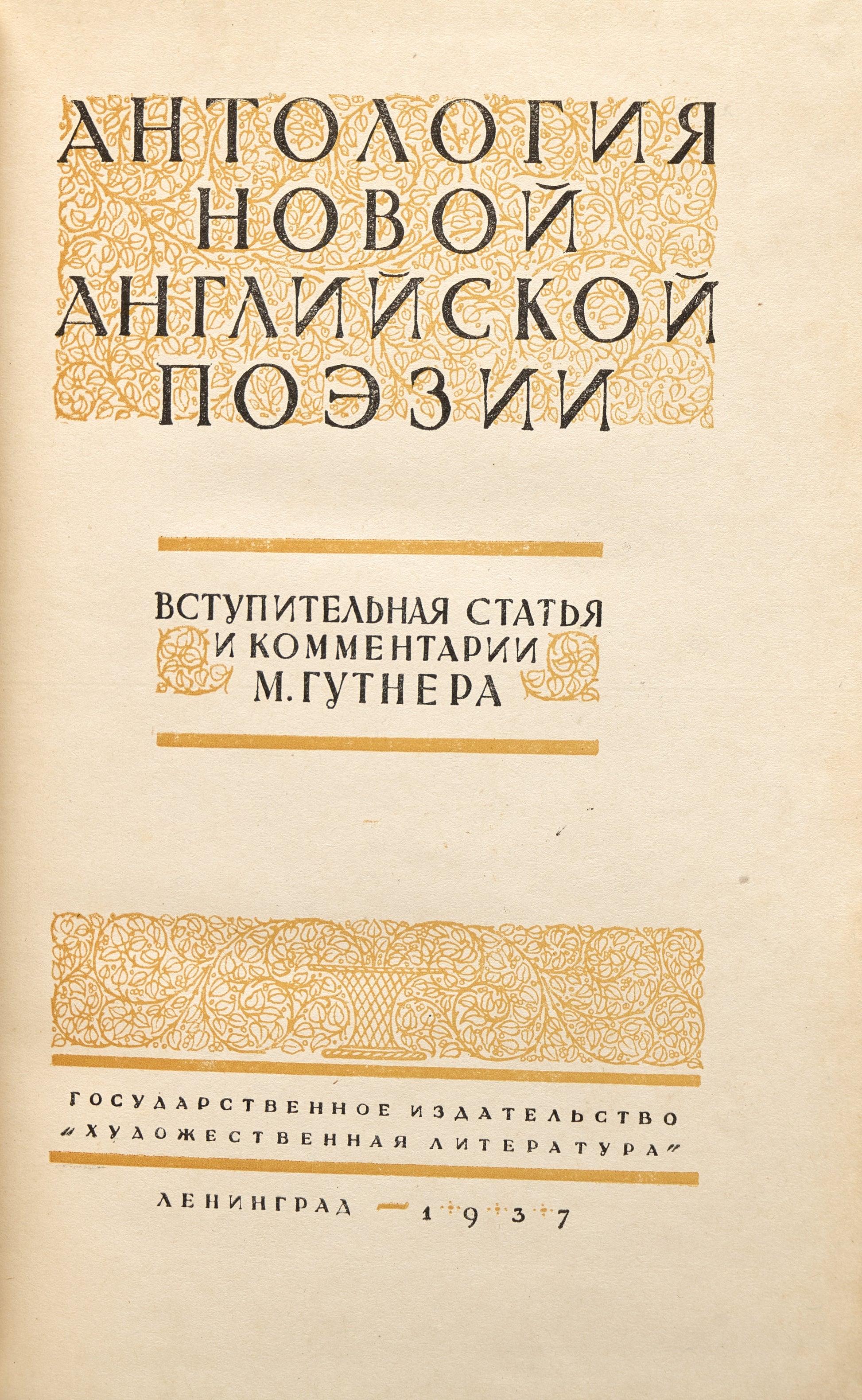 The true compiler of the anthology was the political and literary historian Prince Dmitry Svyatopolk-Mirsky (1890-1939), who was arrested on June 3, 1937, and died in prison. He assembled an outstanding team of translators and drew upon all the knowledge he had amassed about English poetry. Mirsky's biographer, G.S. Smith, noted: 'The translators Mirsky used in his anthology were all based in Leningrad, and he initiated the project during a visit there in September 1935. The finished anthology was in the process of publication when Mirsky was arrested. To preserve the endeavor, his name was completely removed from the book and replaced by that of M. Gutner, one of his team of translators. Gunter, a young scholar who perished, succumbing to starvation during the Second World War, became immortal through this deception' (Smith, G.S. D.S. Mirsky: A Russian-English Life, 1890-1939. Oxford University Press, 2000).