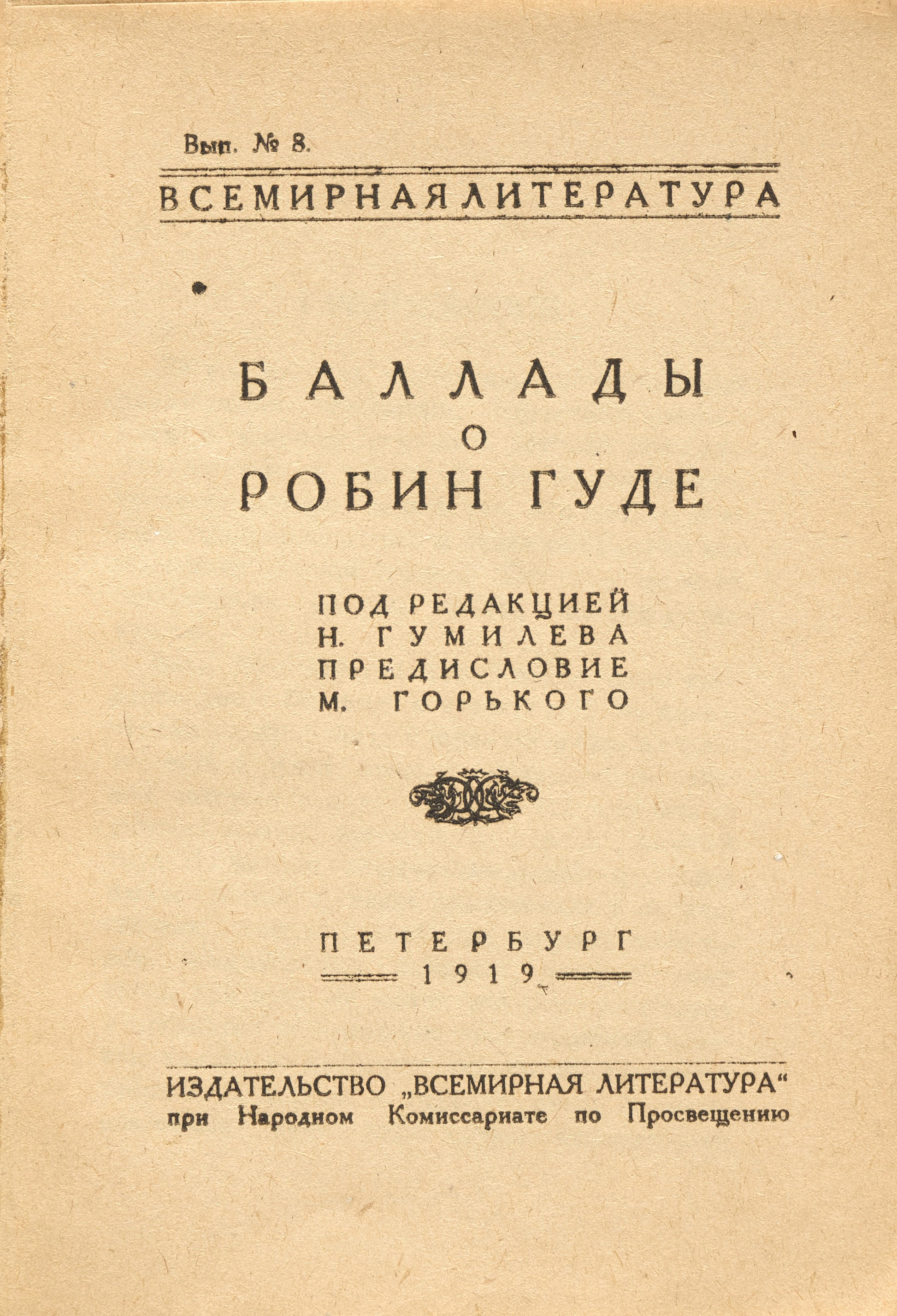 First Russian standalone book of 'Ballads of Robin Hood', edited by the famous Russian poet Nikolai Gumilev, who also translated two of the ballads.
