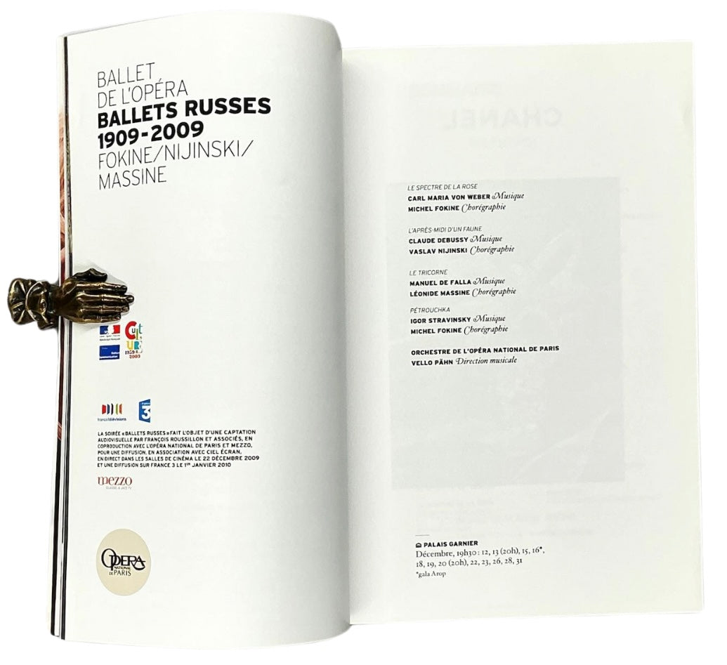 This program book is dedicated to the Paris Opera's December 2009 performance, which featured excerpts from ballets by Fokine ('Spectre de la Rose' and 'Petrouchka'), Nijinsky ('L’Après-midi d’un Faune'), and Massine ('Le Tricorne').