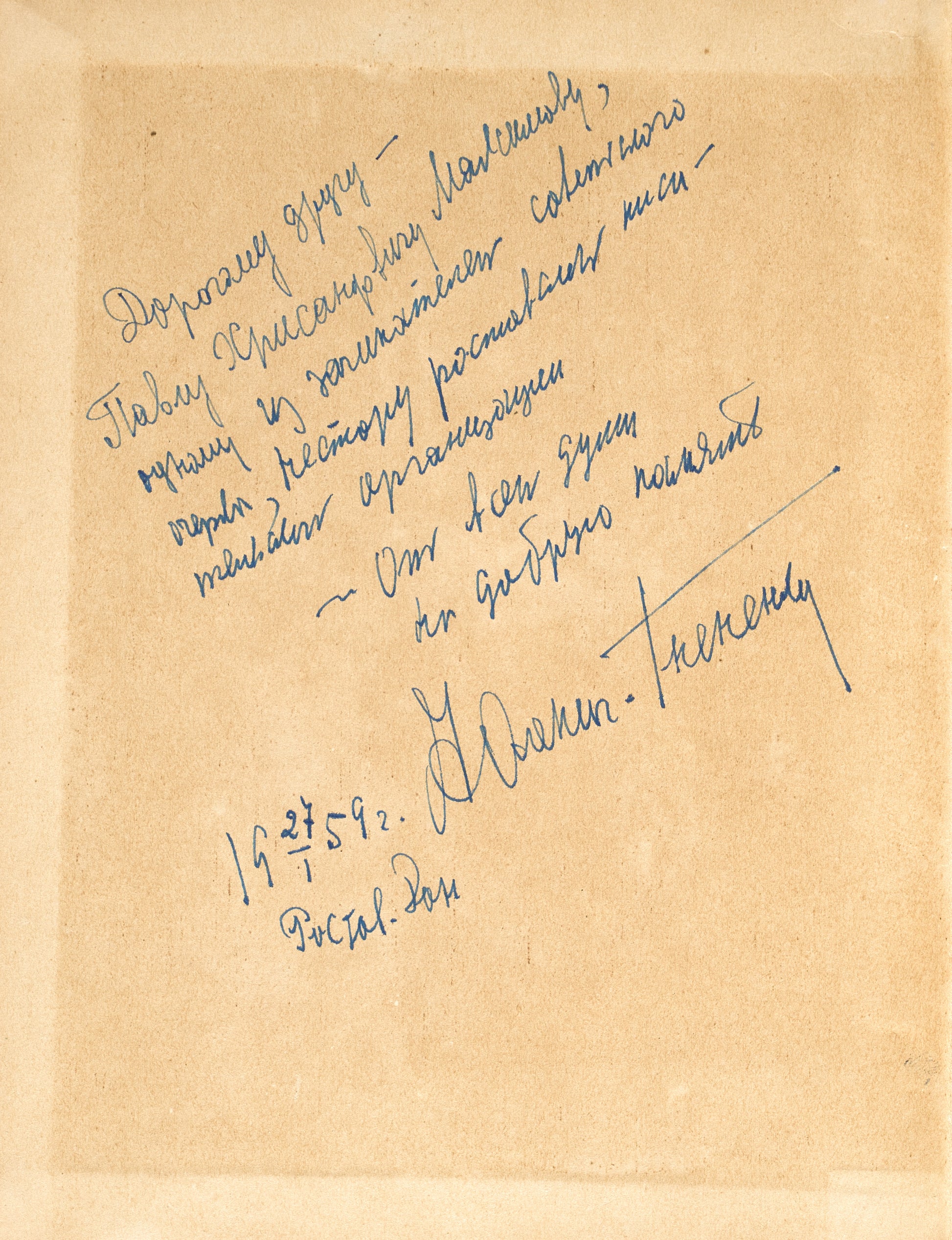 Signed and inscribed by the translator: 'Dorogomu drugu - / Pavlu Khrisandovichu Maksimovu, / odnomu iz zachinateley sovetskogo / ocherka, Nestoru rostovskoy pisa- / telskoy organizatsii / Ot vsey dushi / na dobruyu pamyat' / A. Olenich-Gnenenko / 27|I 1959 g. / Rostov-Don' [To a dear friend - Pavel Khrisandovich Maksimov, one of the esteemed authors of the Soviet essay, the Nestor of the Rostov Writers' Organization. With all my heart in loving memory. January 27, 1959 Rostov-on-Don].