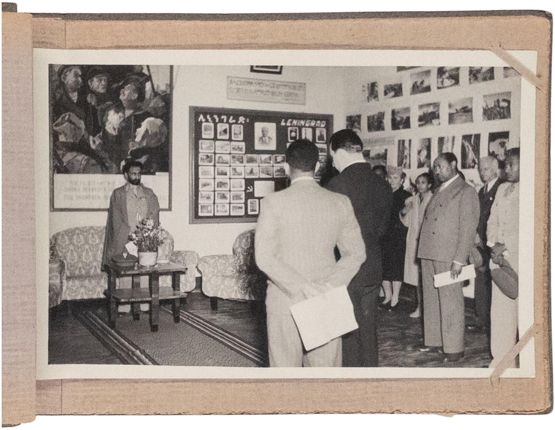 Among the most notable images are those depicting Haile Selassie I (1892–1975), Emperor of Ethiopia from 1930 to 1974, who is also venerated as a divine figure in Rastafarianism, a religion that emerged in the 1930s. Since the collection also includes photographs of the building that housed the permanent Soviet exhibition in Addis Ababa, it is possible that the Emperor was photographed inside the cultural center during its opening. Official sources note that the exhibition opened on 19 March 1945 and was intended to promote Soviet culture, although several of these photographs are dated 1944 on the reverse.