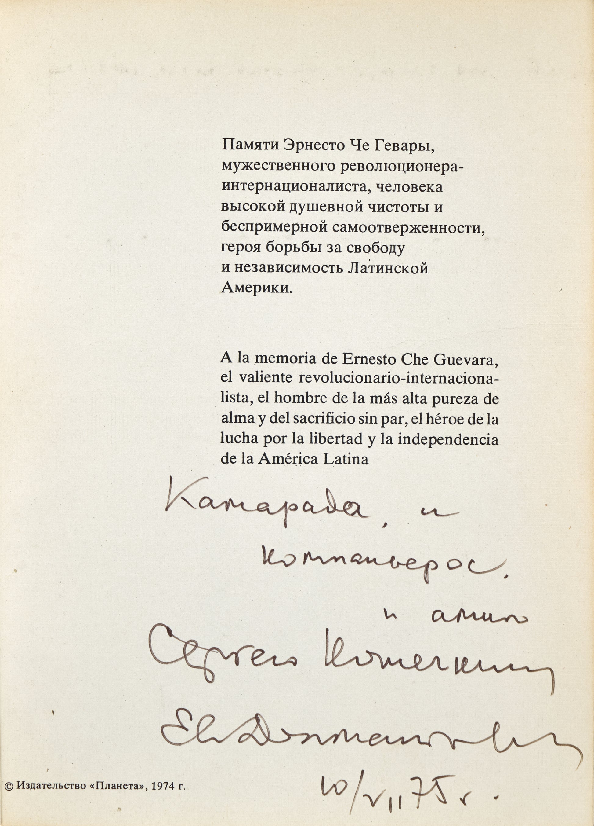 Signed and inscribed by the author: 'Kamarada, i / kompaneros, / i amigo / Sergey Koshechkinu / Ev Dolmatovskiy / 10/VII 75 g.' [To сomrade, companion and friend Sergey Koshechkin Ev Dolmatovskiy July 10 1975].
