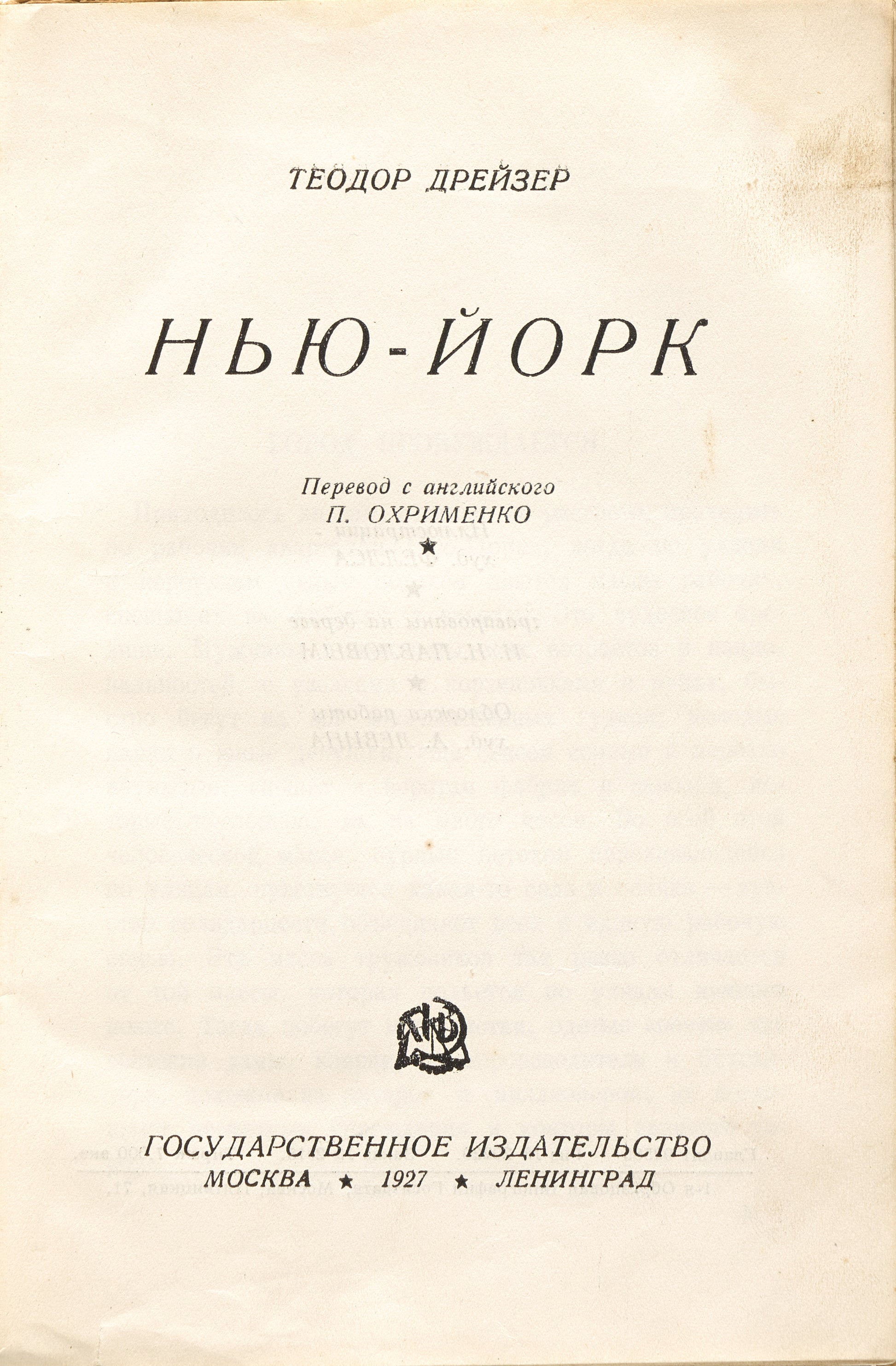 When Theodore Dreiser (1871-1945) arrived in Soviet Russia in November 1927, his collection of essays about life in New York City, 'The Color of a Great City', had already been published there without his authorization. It was published twice in one year: once by the State Publishing House (GIZ) and once by the 'Mysl’' publishing house.