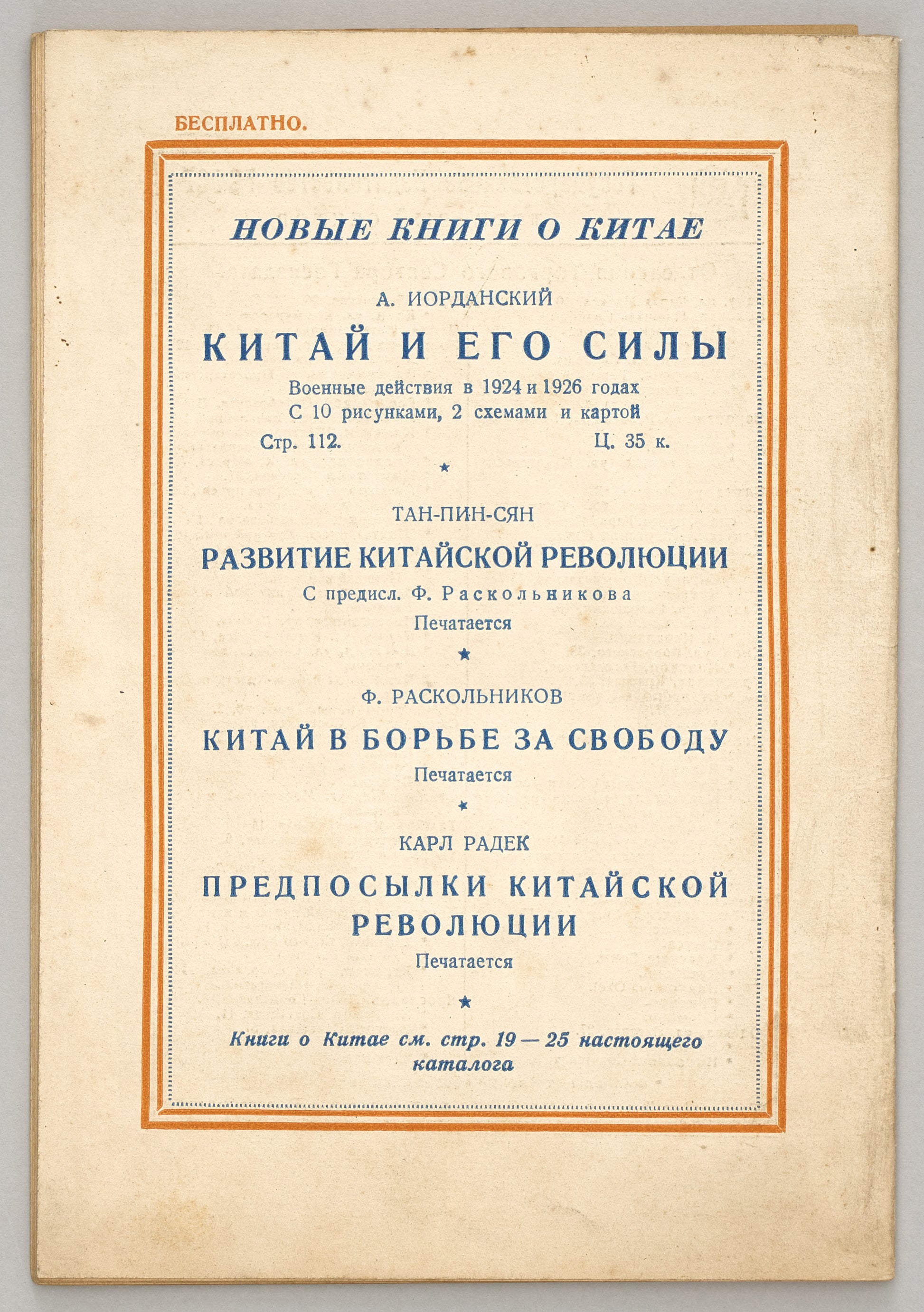 Of particular interest are the works by Leo Trotsky showcased here. In 1926, he was expelled from the Politburo, and in 1927 (the year of the catalog's publication), he was removed from the Communist Party. In January 1928, Trotsky faced a year-long exile in Kazakhstan, followed by deportation to Turkey in February 1929. His name and all his books were banned for several decades.