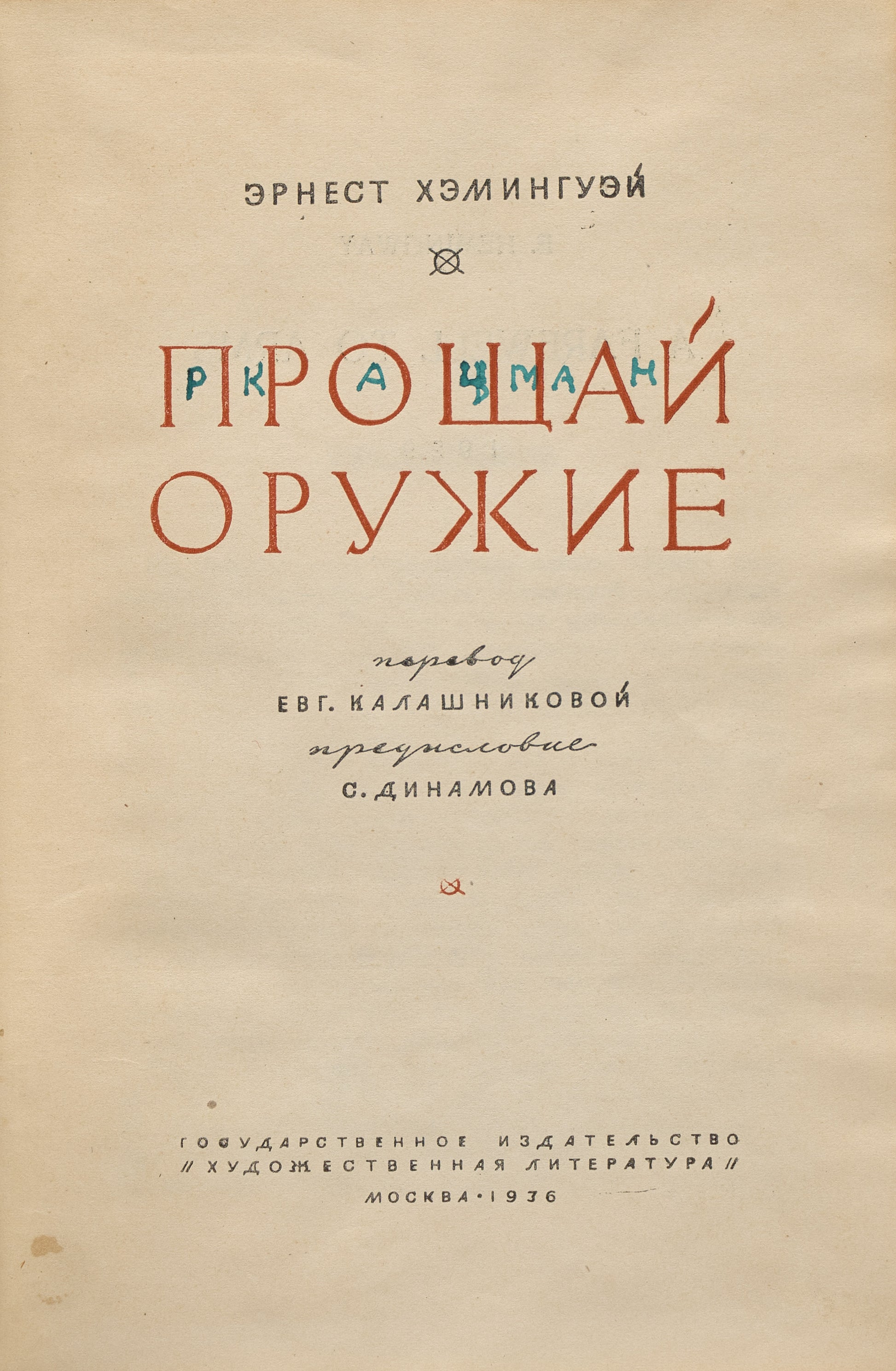 The first excerpts from Hemingway's novel 'A Farewell to Arms' (1929) appeared in Russian in 1934, published in the magazine 'Znamya' (No. 4) and translated by Petr Okhrimenko. Two years later, this translation was published in its entirety in the same magazine. Around the same time, another translation by Evgeniia Kalashnikova (1906–1976) emerged: first as a fragment in 'Internatsional’naya Literatura' (with the note 'authorized translation') and later as a standalone book.
