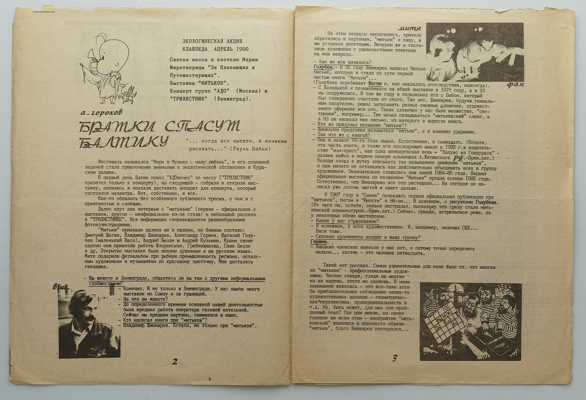 It contains articles covering the music festival in Klaipeda, Lithuania, and a Bob Dylan concert at Eisenhower Hall Theatre (translated extract from 'Rolling Stone' magazine), an interview with the Mitki art group (featuring Vladimir Shinkarev, Dmitri Shagin, and Vasily Golubev), and a poster of the 'Ado' band.