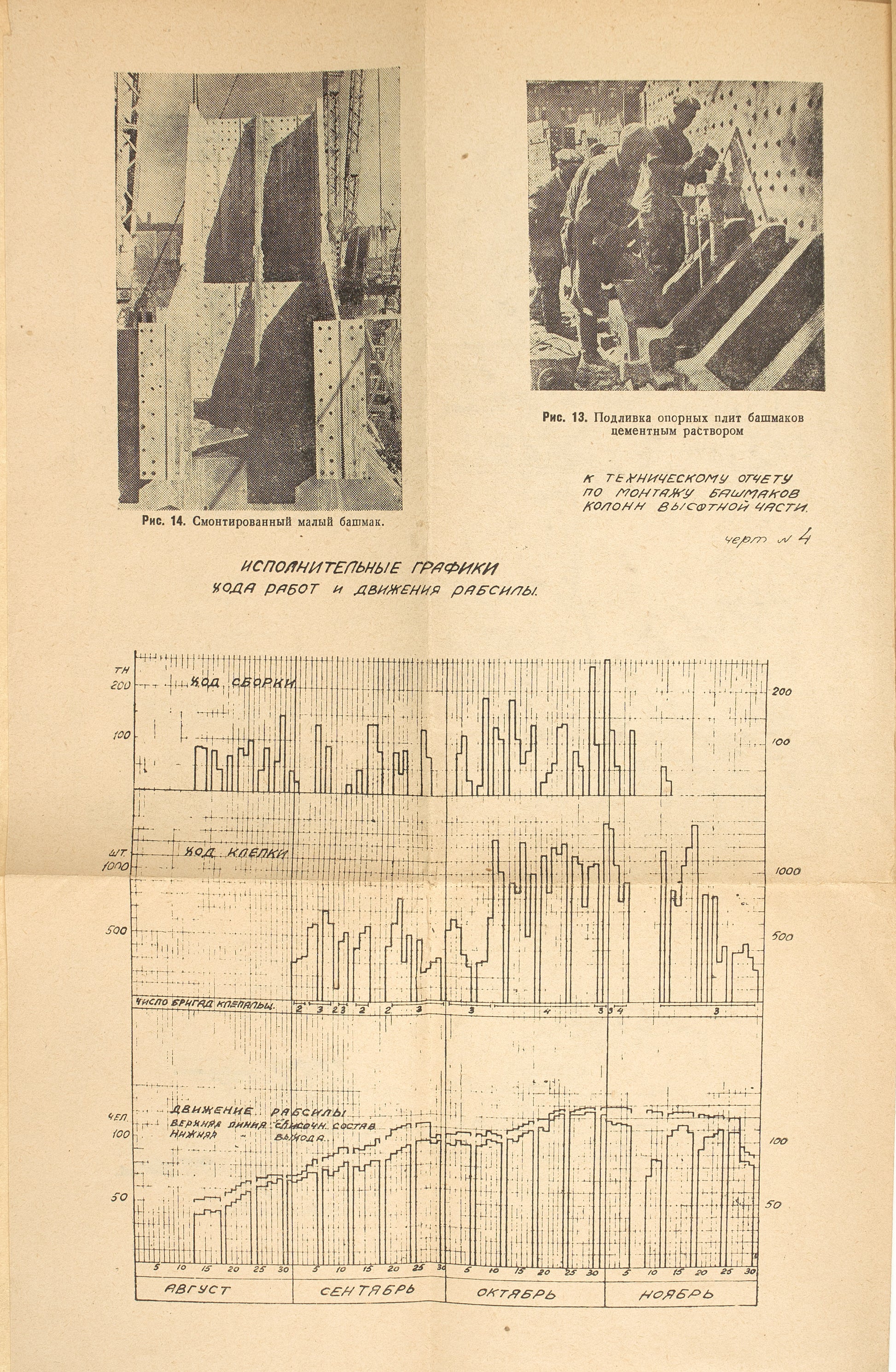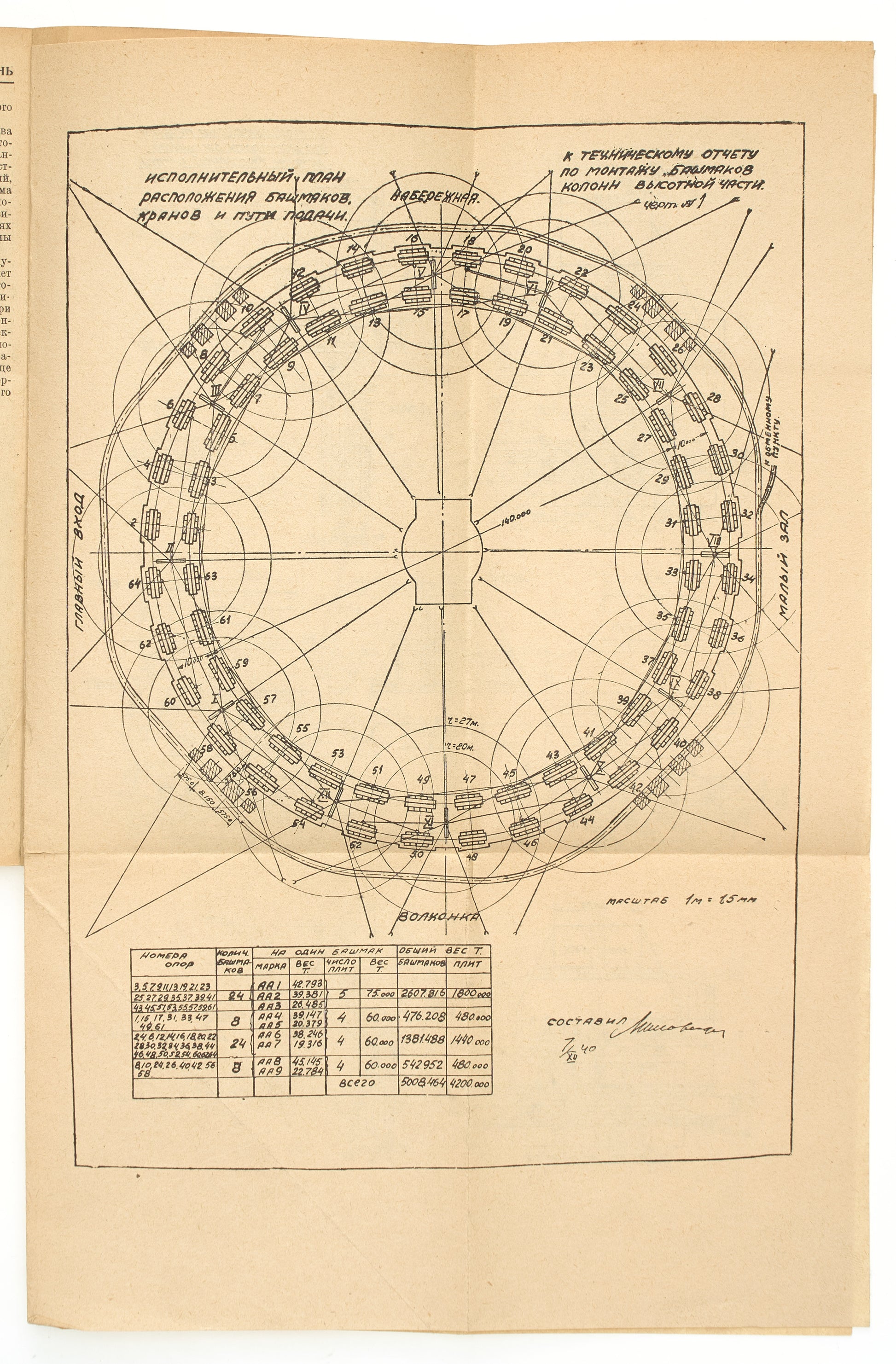These bulletins were prepared by the Construction Management of the Palace of the Soviets and were distributed among professionals. The bulletins focused on the construction progress, covering topics such as winter construction methods, granite and marble mining, escalator and elevator planning, column shoe installation, land surveying equipment, canalization system, facade lighting, and more.