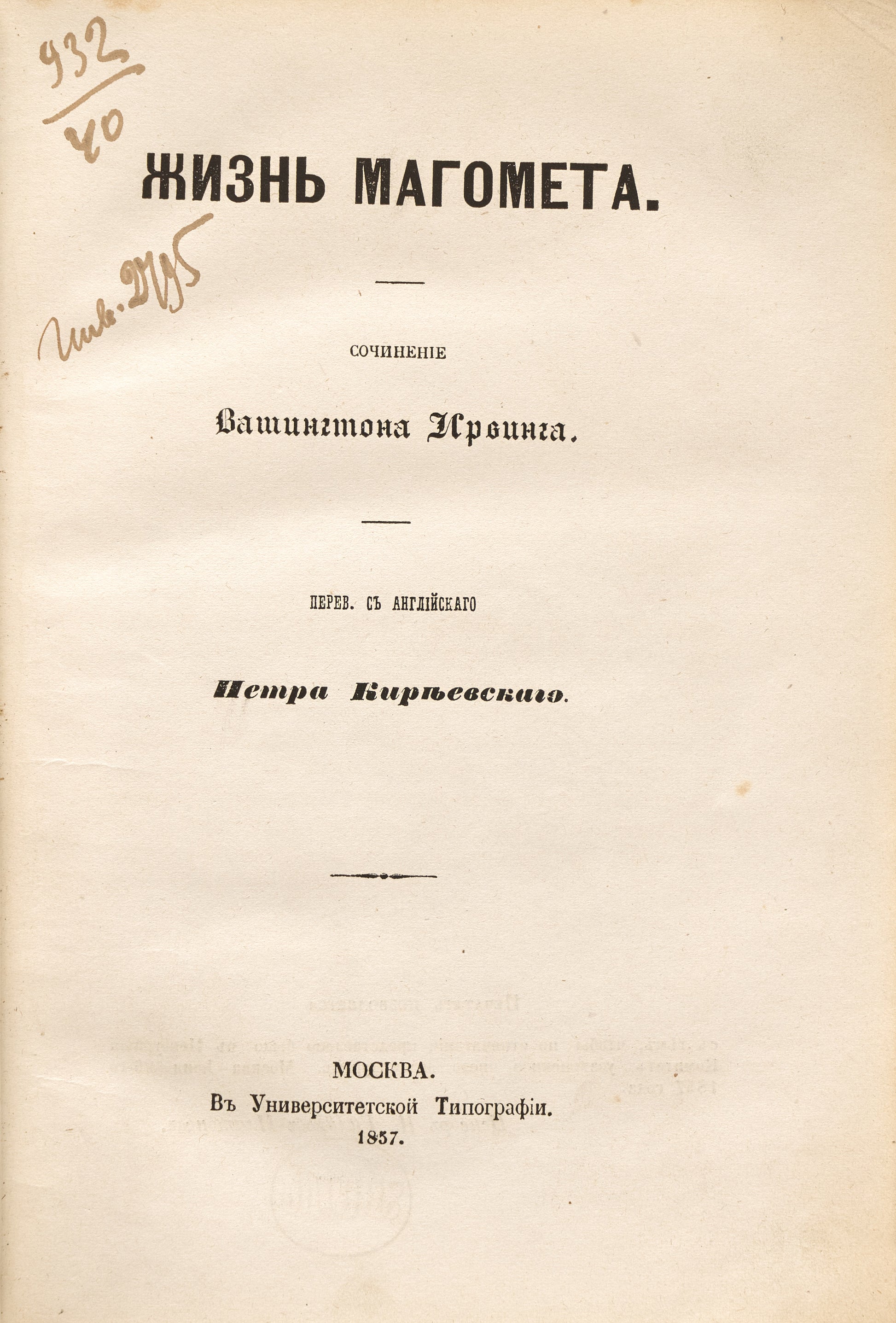 The book was translated into Russian by Pyotr Kireevskii (Kireevsky; 1808–1856), a folklorist, translator, philologist, and ardent Slavophile. Kireevsky’s involvement is especially intriguing, given the Slavophile movement’s emphasis on Russia’s spiritual heritage and suspicion of Western liberalism—making his choice to translate this Western-written biography of the founder of Islam particularly significant. The translation was published posthumously.