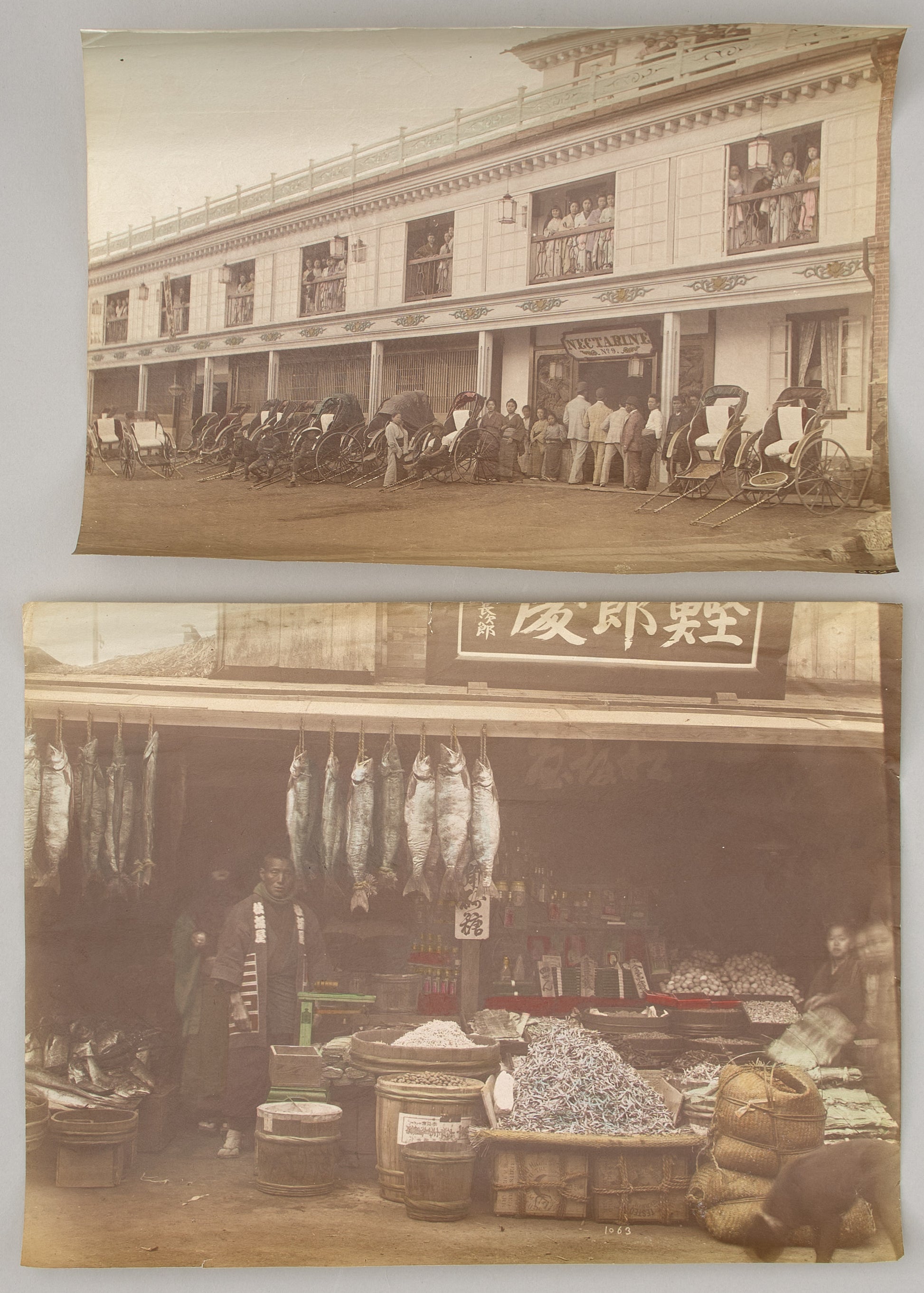 Furthermore, it's crucial to emphasize particular photos in this collection. These encompass depictions of prostitutes standing on the balconies of 'The Nectarine brothel' in Yokohama (a globally renowned establishment also recognized as No. 9 or Jimpuro, which maintained a prestigious status within the city until the cataclysmic Great Kanto Earthquake of 1923), the solemn funeral procession, the Buddhist monks, the sago palms that lend grace to the courtyard of the Myōkokuji temple in Sakai (Osaka), as well as the specialized shops dedicated to umbrellas, porcelain, and grocery.