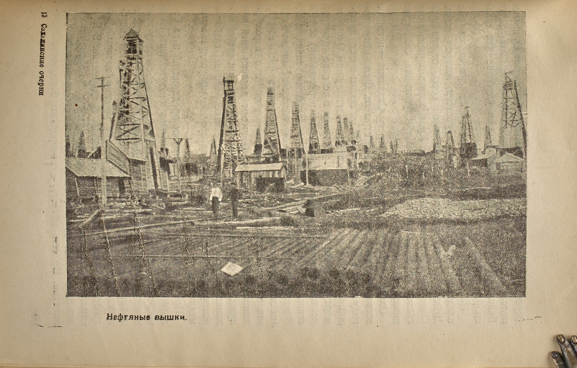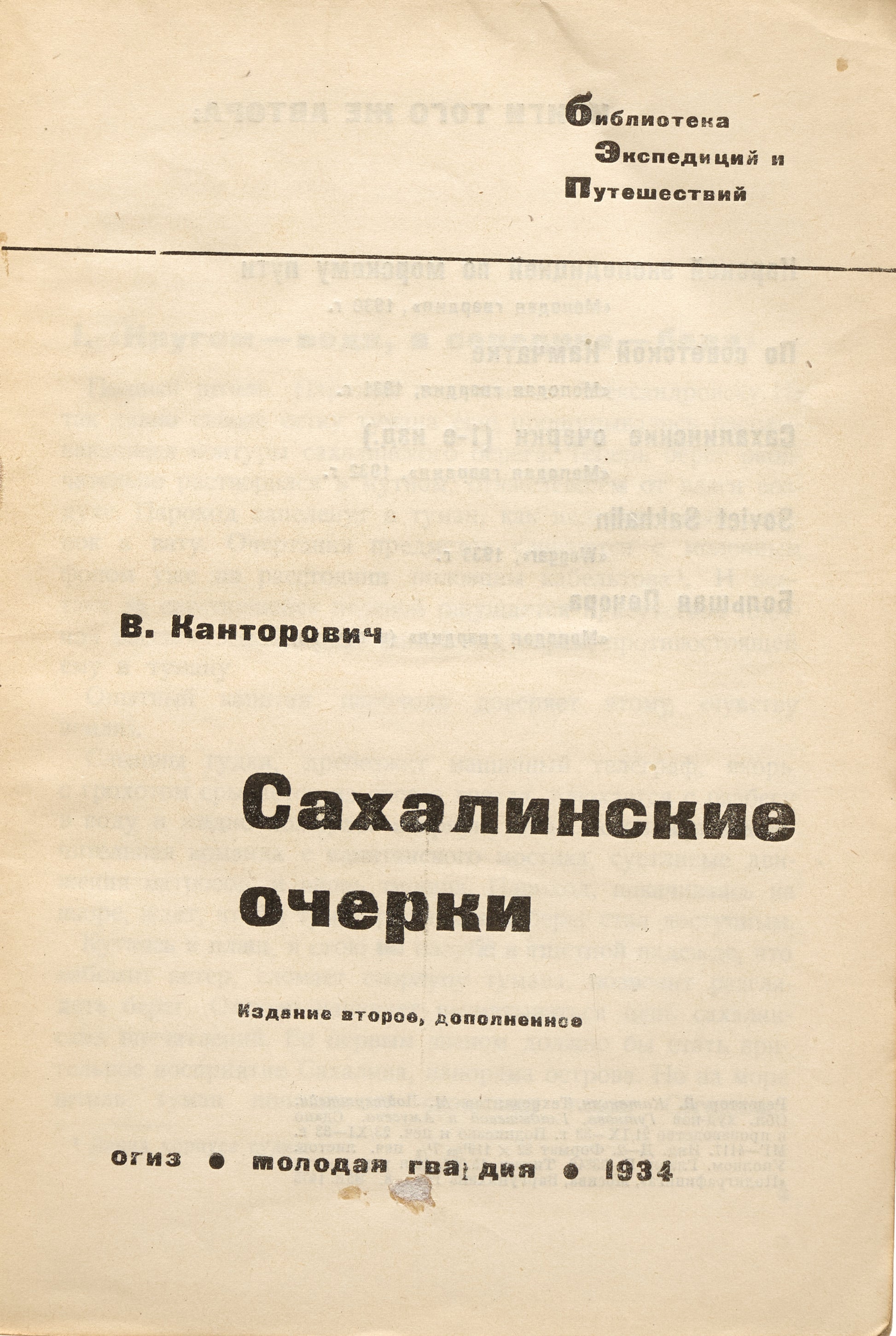 The first edition of his book dedicated to Sakhalin was published in 1932 and underwent three subsequent republications. In this work, Kantorovich places emphasis on the petroleum industry and accompanies the text with photographs of oil rigs and storage facilities in the port. The book concludes with a detailed map of Northern Sakhalin illustrating the author's route and the region's railway infrastructure.