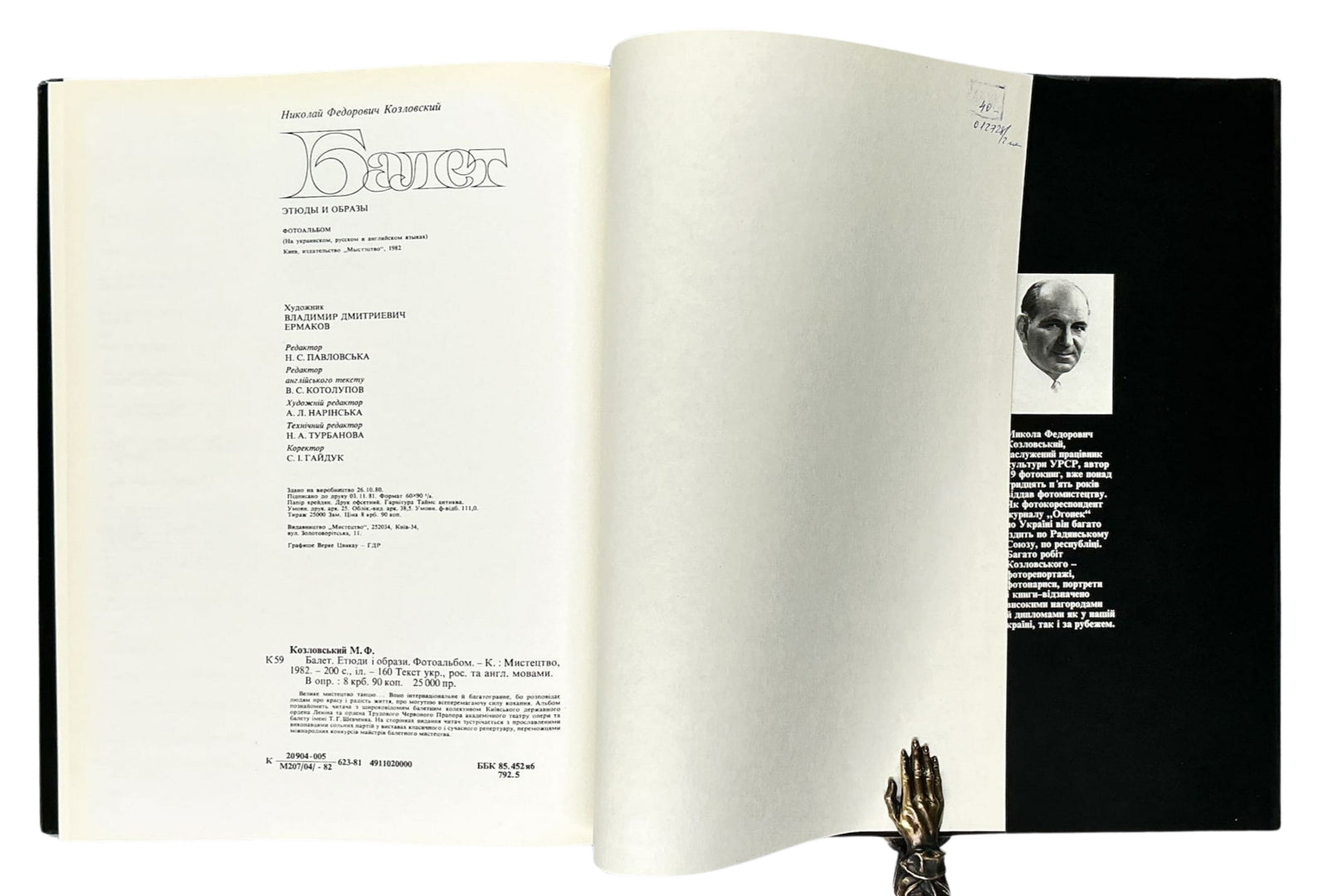 This photobook, described in its annotation as a ‘photostory’, was created by the renowned Ukrainian photographer Mykola (Nikolai) Kozlovsky (1921–1996). It focuses on the ballet dancers and the artistic traditions of the Kyiv State Opera and Ballet Theater named after Taras Shevchenko. Kozlovsky, known for his artistic and documentary photography, worked as a special photo correspondent for the Ukrainian edition of the magazine ‘Ogonek’. His talent earned international recognition: in 1955, Edward Steichen included Kozlovsky's photograph of traditional dancers in the globally touring exhibition ‘The Family of Man’ at the Museum of Modern Art.
