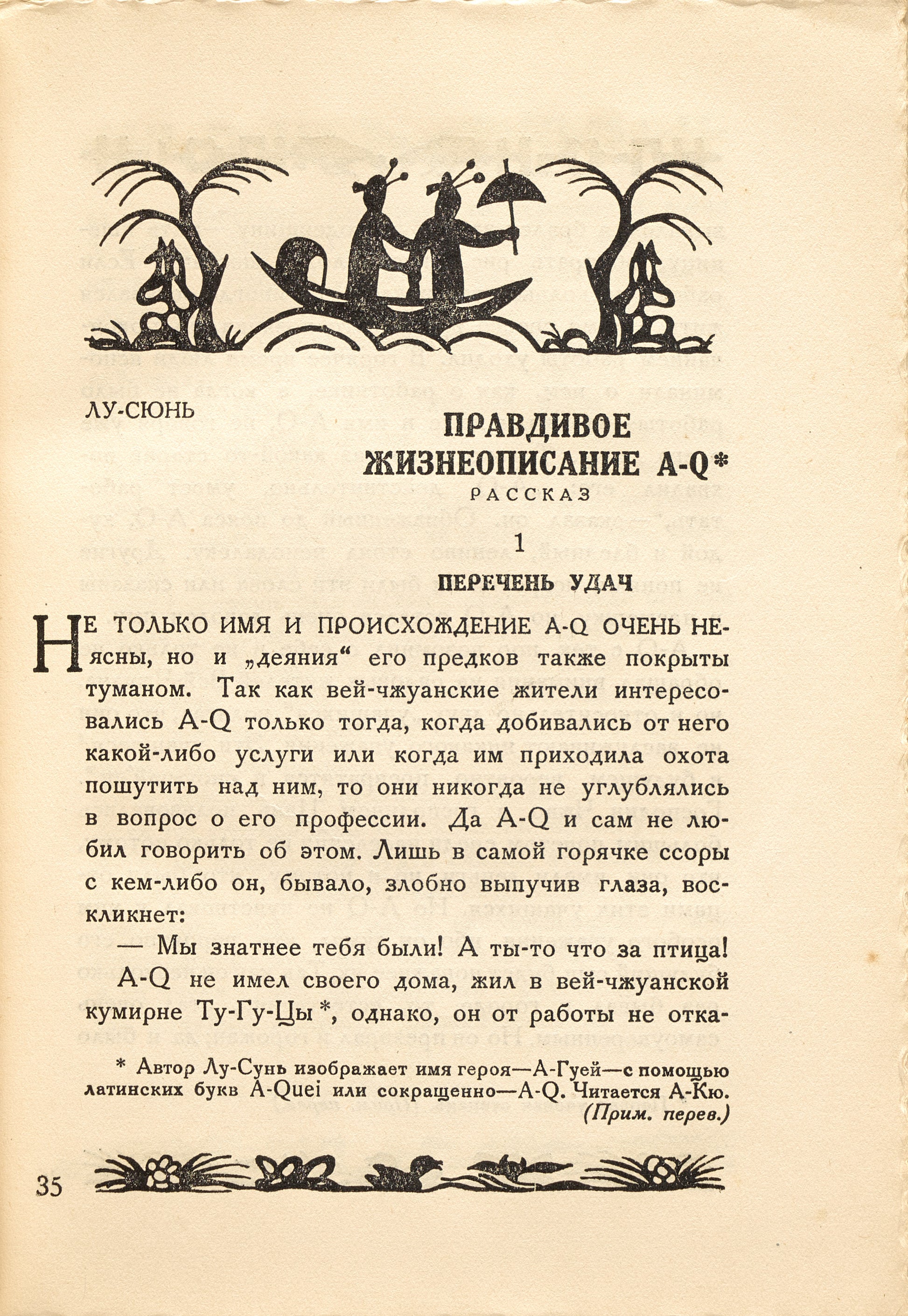 First edition of this translation of Lu Xun’s 'The True Story of Ah Q'. Early collection of Chinese modern prose in Russian. Very rare. One of 5 000 copies published.