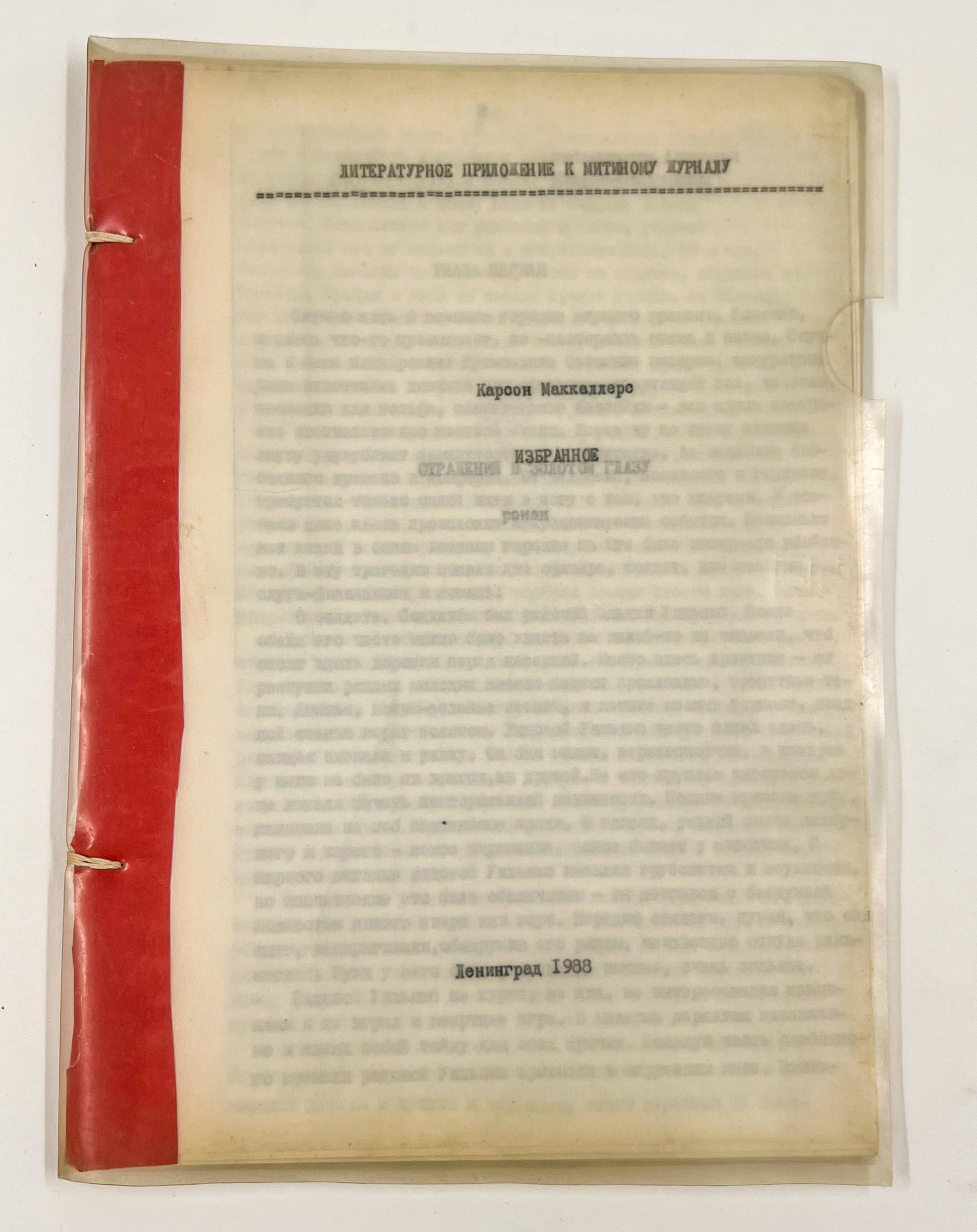 McCullers' first Russian book, ‘Clock Without Hands’, appeared in 1966. Despite sporadic translations and publications of her works in anthologies and separately, McCullers remained relatively unknown to the wider public until recently. The book titled ‘Reflections in a Golden Eye’, containing the novel and stories from this typescript, was only officially published in Russia in 2000.