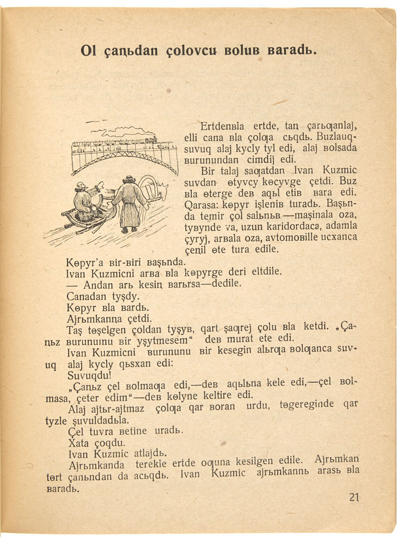 Karachay-Balkar is a Turkic language spoken by the Karachays and Balkars residing in the North Caucasus. After the October Revolution, as part of a state initiative to Latinize the Karachay and Balkar languages, educators developed a new alphabet based on Latin letters. This Latin-based alphabet was in use from 1929 to 1939, until it was later replaced by an alphabet based on Cyrillic letters, which was officially adopted.