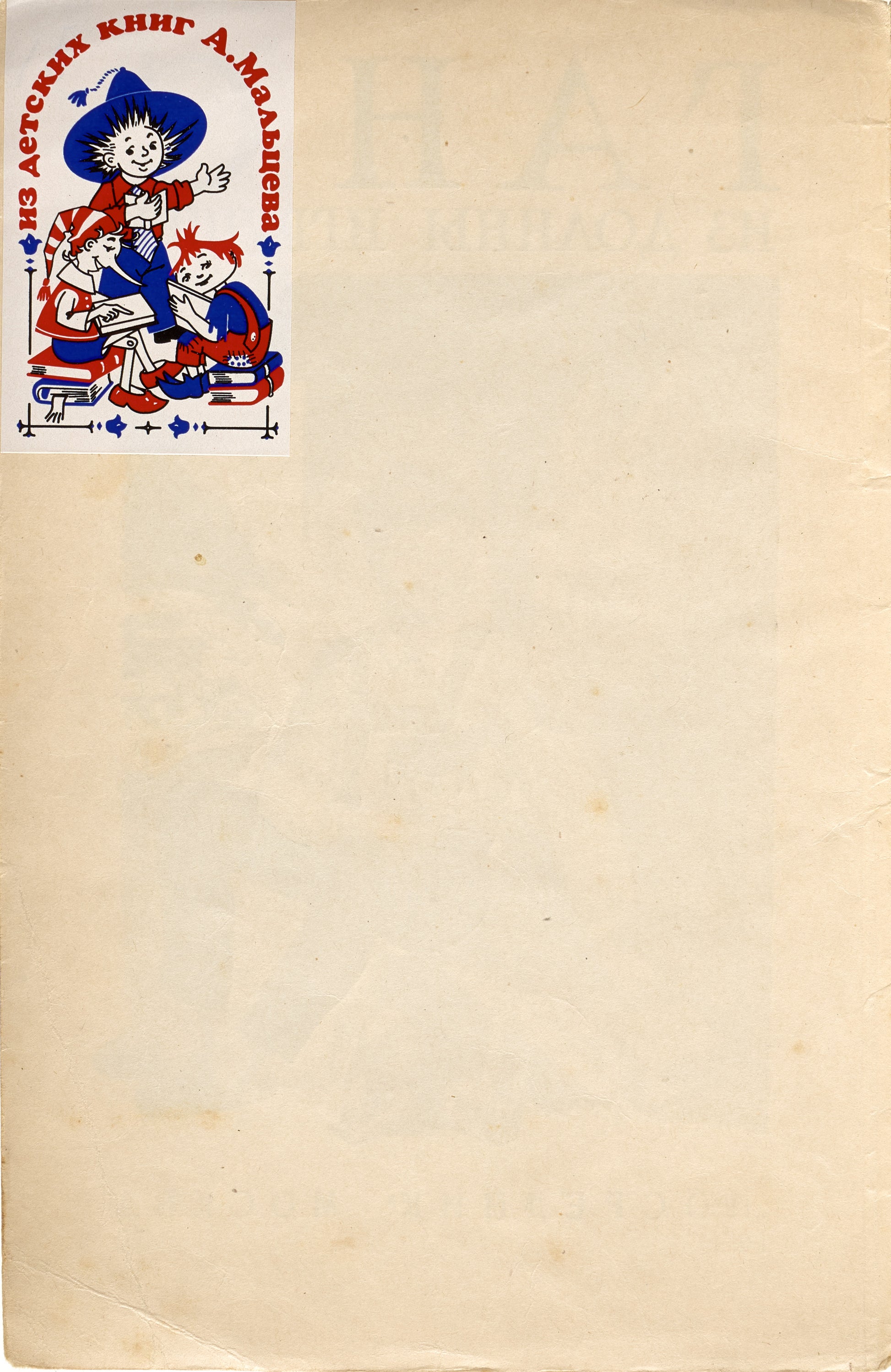In good condition, wrappers worn and very faintly spotted, spine foot with short tears, pictorial bookplate 'Iz detskikh knig A. Mal'tseva' on front cover verso.