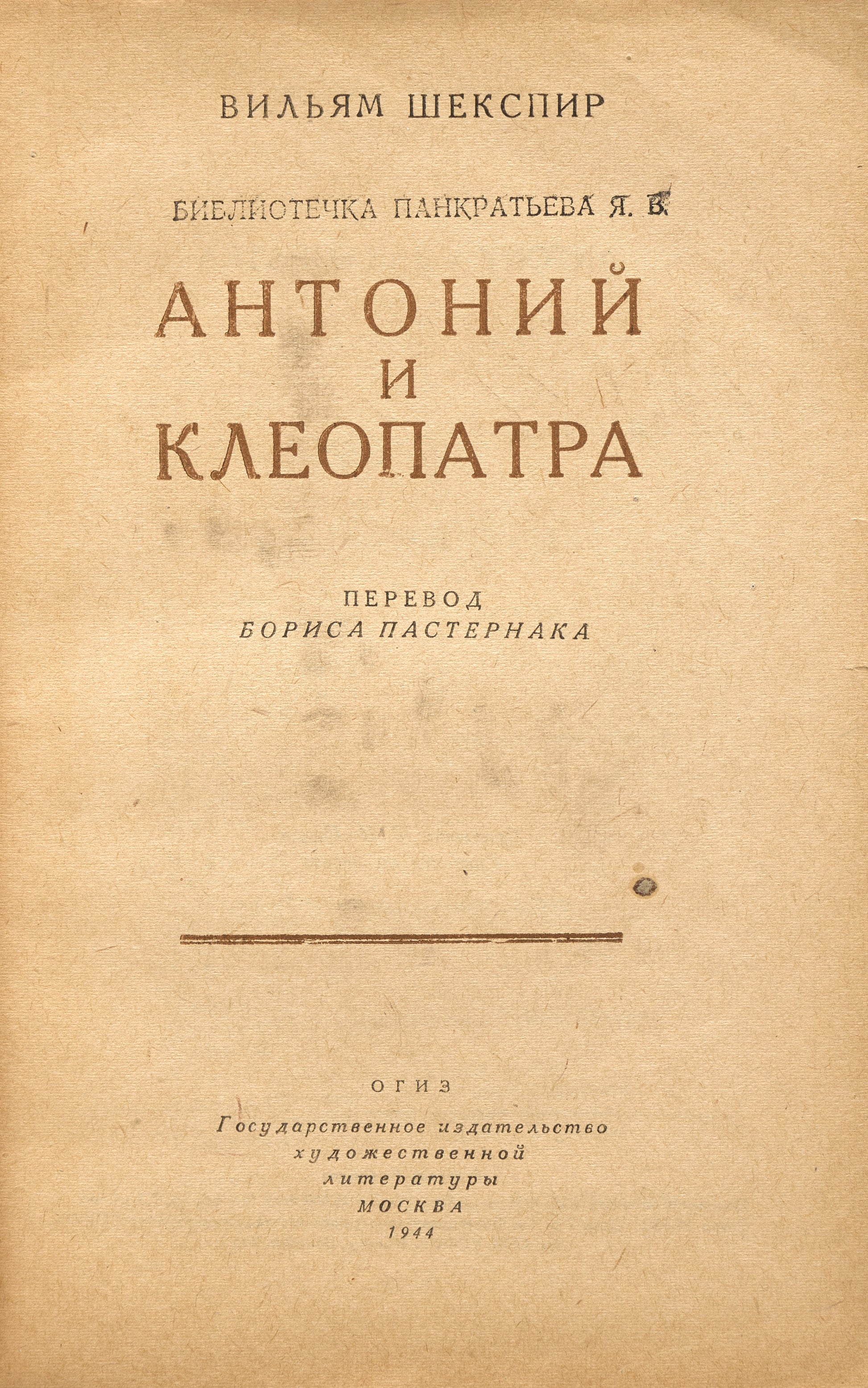 First edition of 'Antony and Cleopatra' translated by Pasternak. This is the only separate edition of his translation. Printed during wartime (approved for printing on June 3, 1944).
