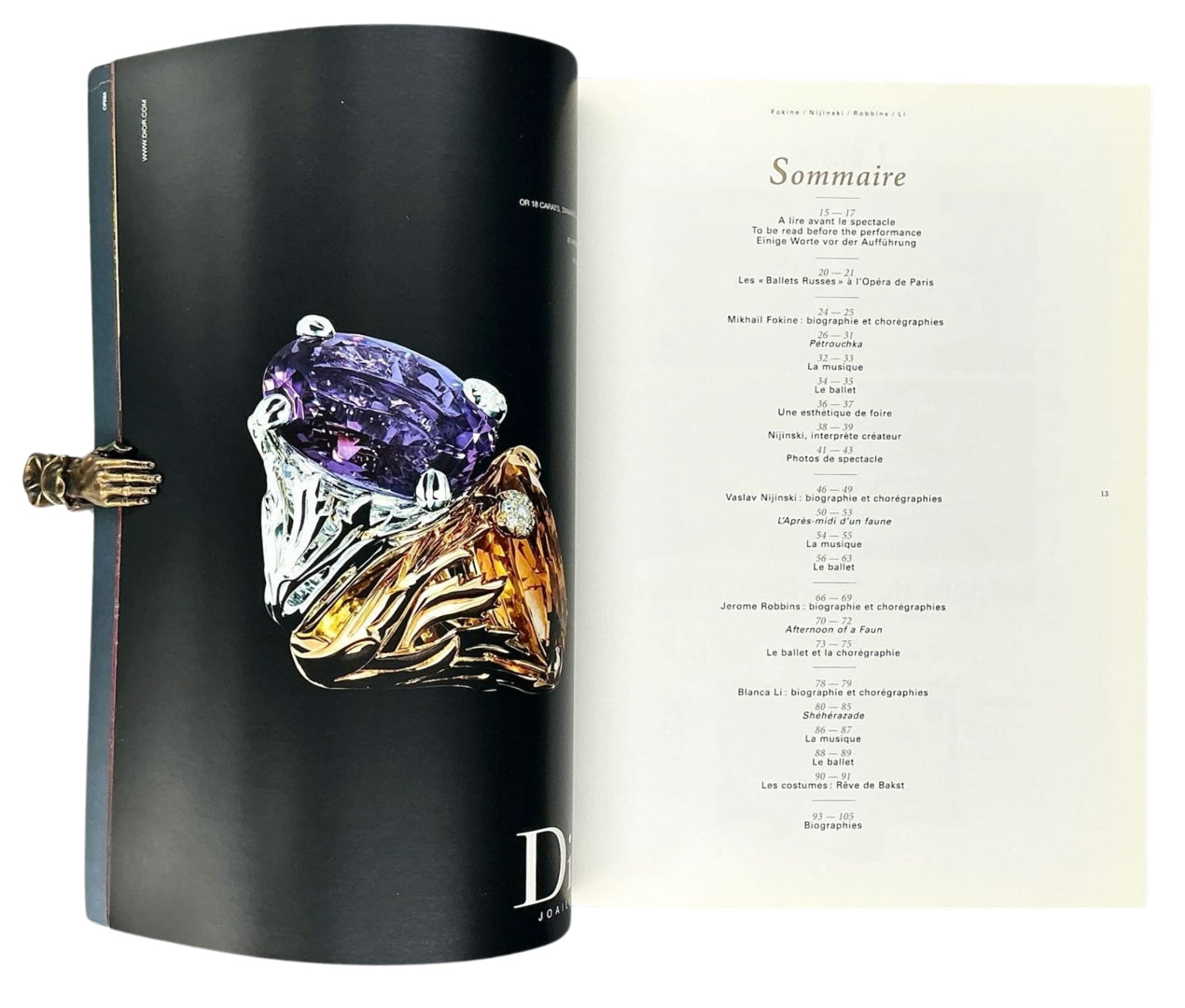 The program book is dedicated to the performance presented by the Paris Opera from December 2001 to January 2002, featuring excerpts from the ballets ‘Petrouchka’, ‘L'Après-midi d'un faune’ (in two versions), and ‘Sheherazade’, choreographed by four key figures in ballet: Mikhail Fokine, Vaslav Nijinsky, Jerome Robbins, and Blanca Li.