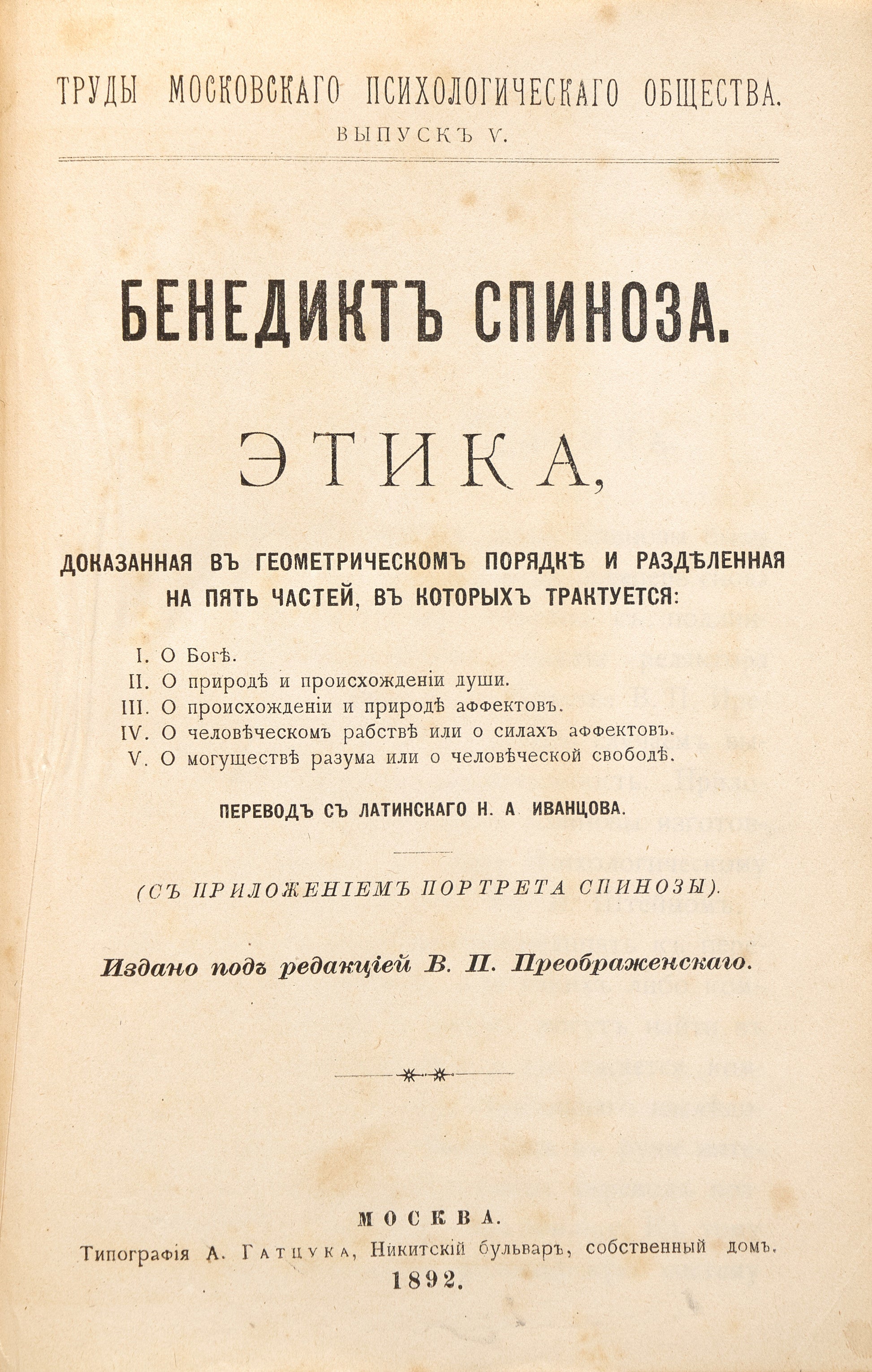 Ethics, Demonstrated in Geometrical Order. First edition of the best Russian translation.