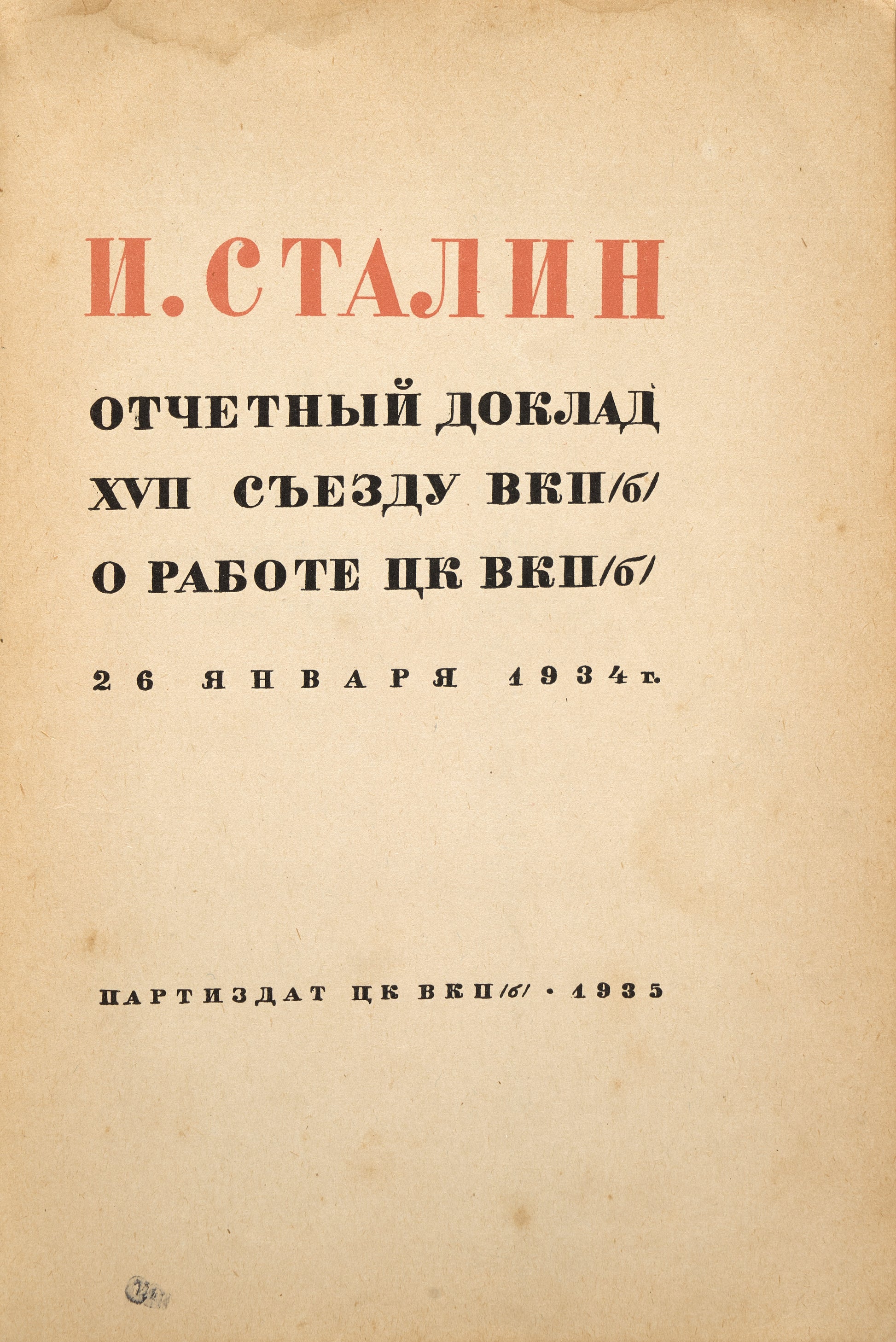 Stalin, I. [Report of the XVII Party Congress on the Work of the Central Committee of the All-Union Communist Party (Bolsheviks) of January 26, 1934]. Otchetnyi Doklad XVII S'ezdu Partii o Tabote TsK VKP(b) 26 Ianvaria 1934 g.