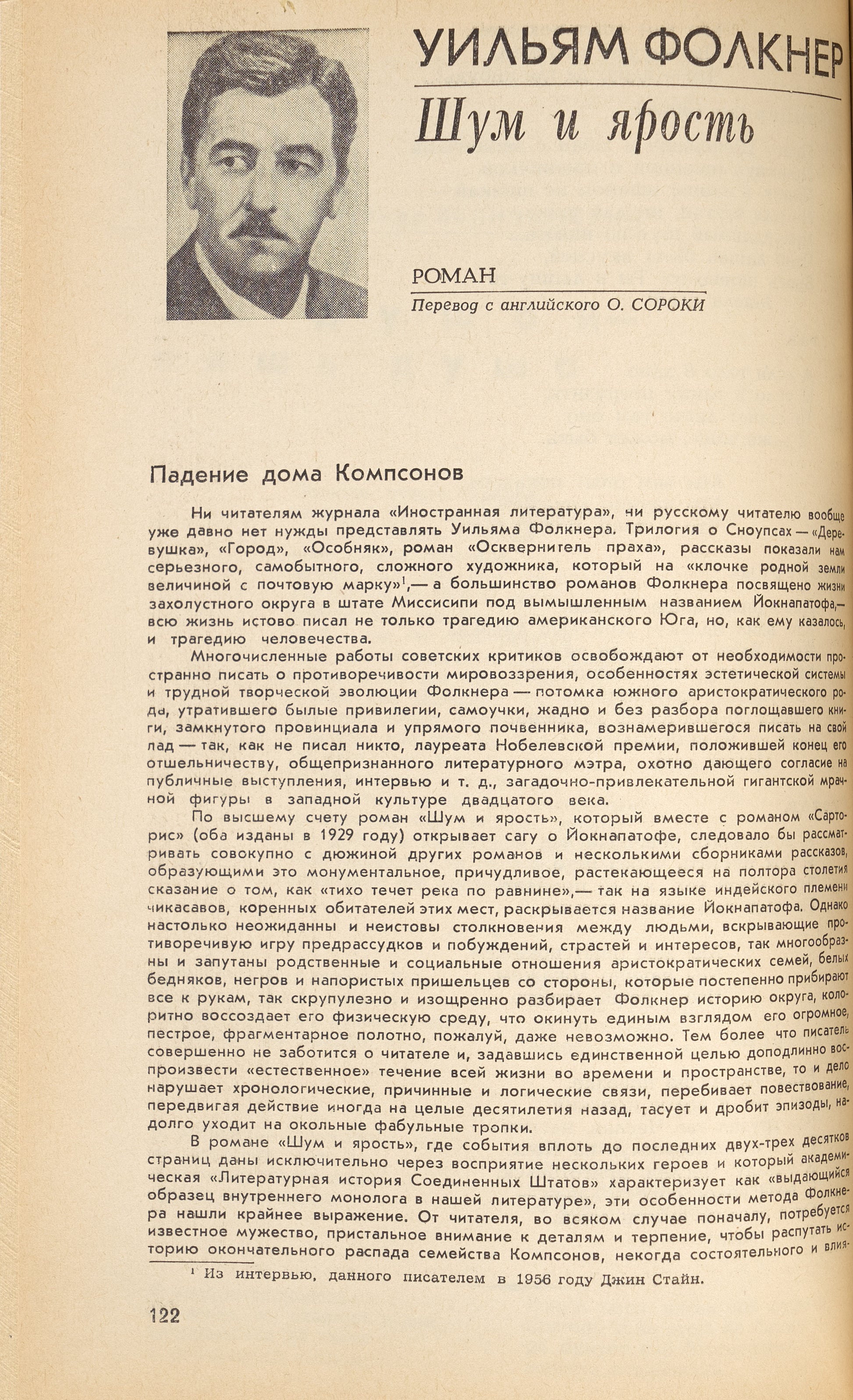 - 'Knight's Gambit' (from 'Zvezda', #9, 1990), 'The Old People', and 'The Sound and the Fury' (from 'Inostrannaia literatura', #1-2, 1973; Libman, #6360) by William Faulkner; the first Russian translation of 'The Sound and the Fury'.