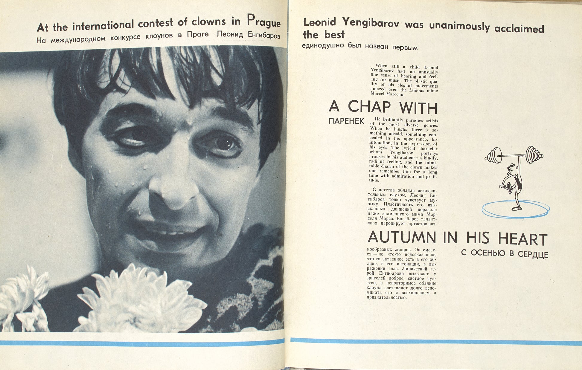 This photobook by the circus reviewer and chief editor of 'Soviet Estrada and Circus' magazine Nikolay Krivenko is devoted to the Soviet circus: the well-known Soviet clowns (Oleg Popov, Yuri Nikulin, Leonid Yengibarov, Mikhail Rumyantsev), aerialists (Valentina Surkova), jugglers (Grigory Novak, Nikolay Olkhovikov), animal trainers (Durov's dynasty, Irina Bugrimova, Valter Zapashny, Margarita Nazarova), illusionists (Igor Kio), the circus on ice, pupils of the circus school, etc.