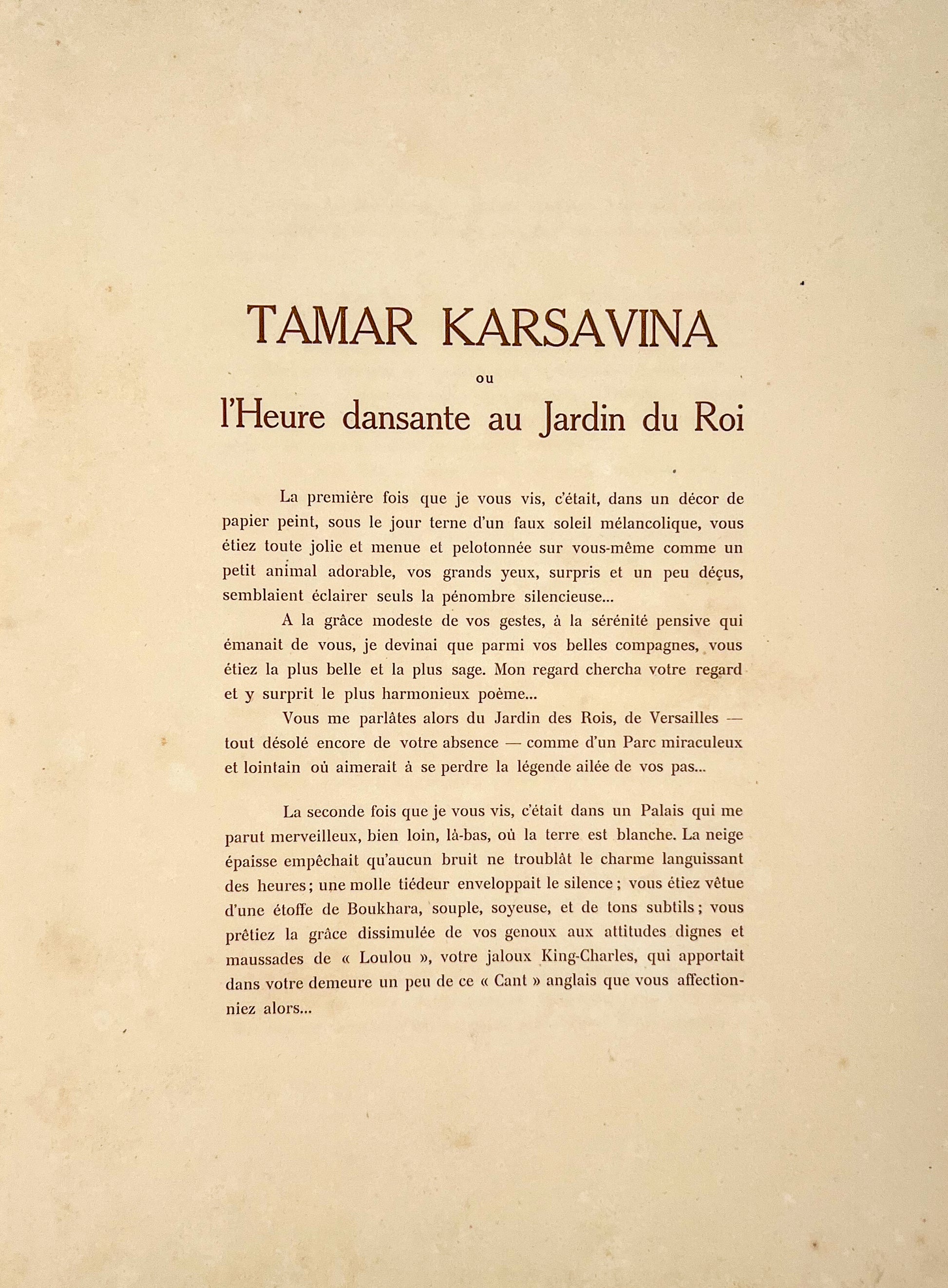 [Tamar Karsavina: or The Dancing Hour in the King's Garden]. Tamar Karsavina: ou l’Heure dansante au Jardin du Roi.
