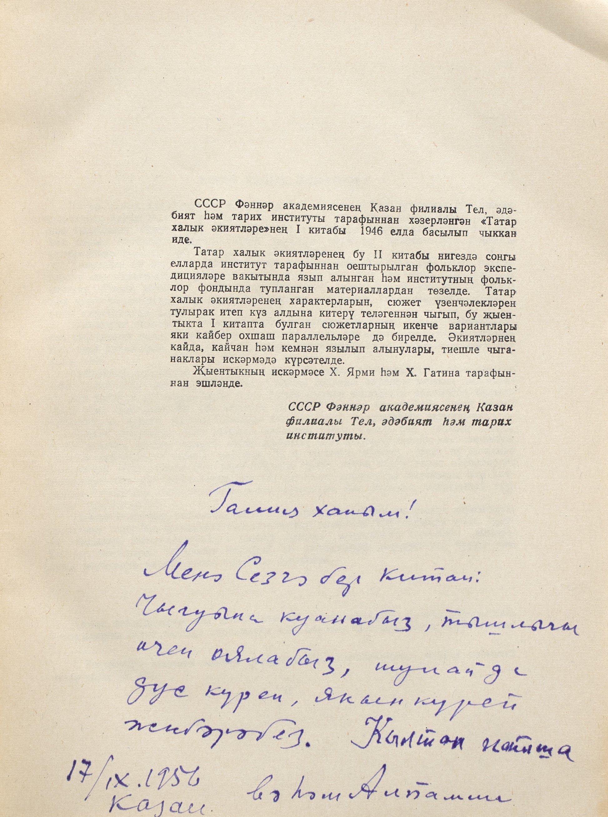 Inscription in Tatar on p. V: 'Ğäliyä xanım! / Menä sezgä ber kitap: / çığuwına quwanabız, tışlığı / öçen oyalabız, şulay da / dus kürep, yaqın kürep / cibäräbez. Qıltap patşa / 17/IX.1956 / Qazan / wä häm Alpamşa' [To Ms. Galiya! Here is a book for you: We are happy about its release, embarrassed about its cover, but still send it to you as a friend, with warmth. 17/IX/1956. Kazan. Kiltap Patsha and also Alpamsha].