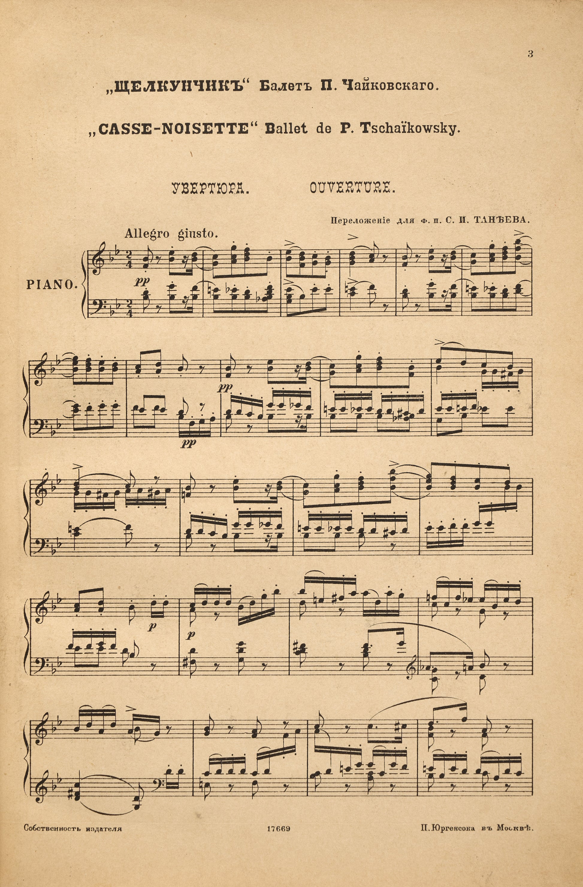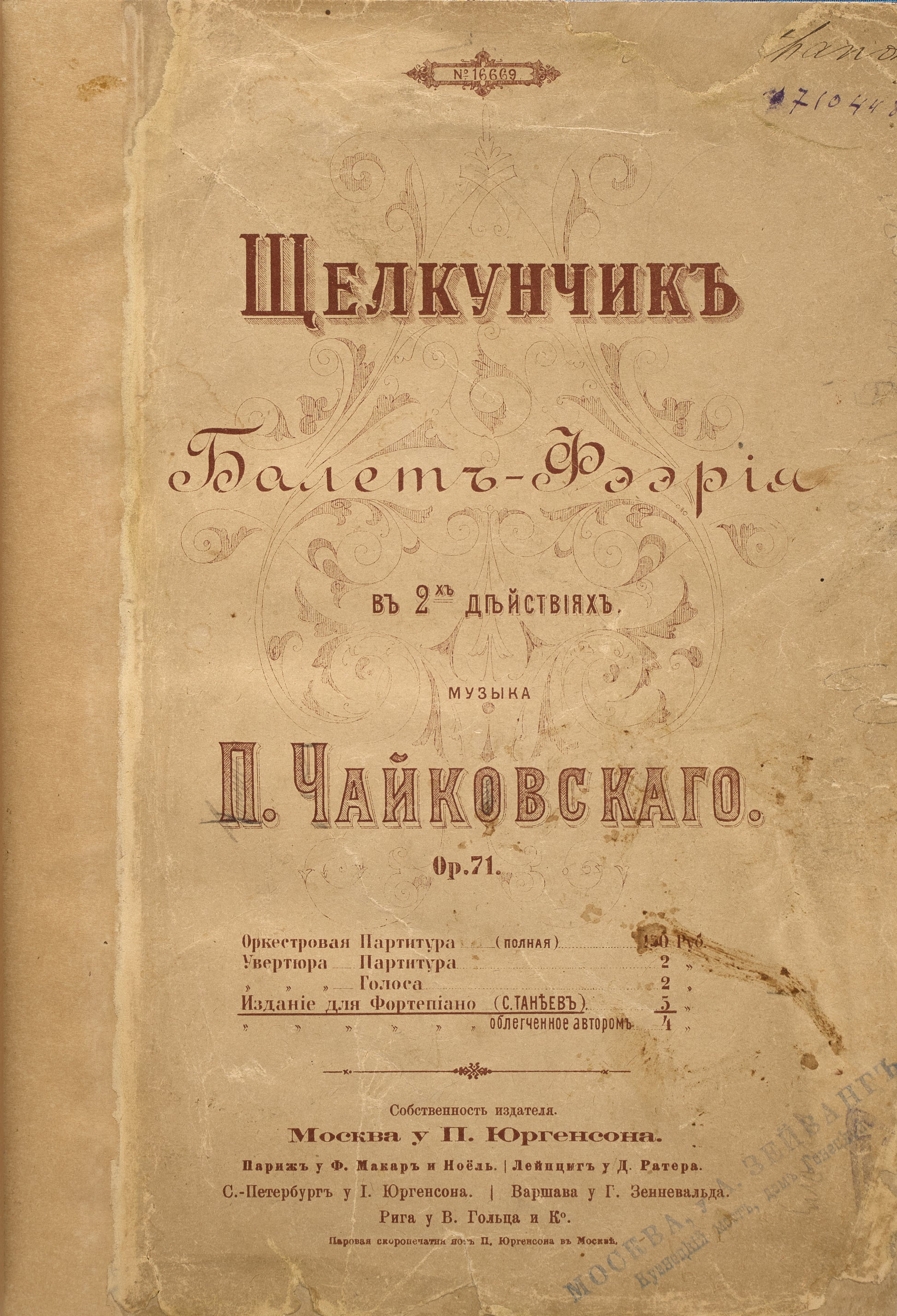 [The Nutcracker: Fairy Ballet in 2 Acts. Music by P. Tchaikovsky. Op. 71. For Solo Piano (S. Taneyev)]. Shchelkunchik: Balet-Feeriia v 2-kh deistviiakh. Muzyka P. Chaikovskogo. Op. 71. Izdanie dlia fortepiano (S. Taneev) = Casse-Noisette: Ballet-Feerie en 2 actes. Musique de P. Tschaikowskky. Op. 71. Pour piano seul (S. Taneeff).