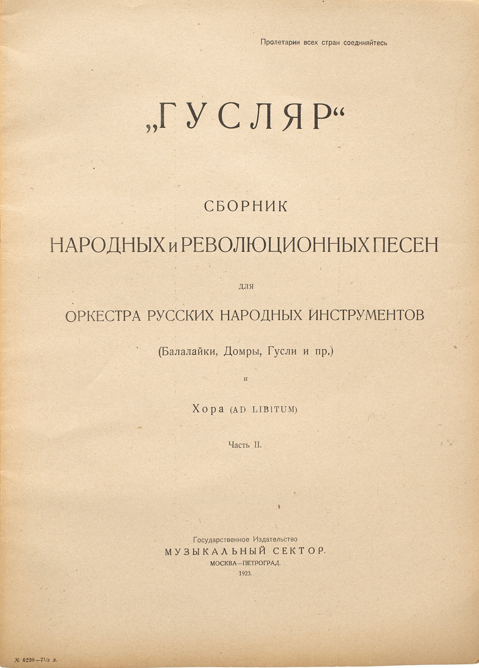 ["The Gusliar": A Collection of Folk and Revolutionary Songs for an Orchestra of Russian Folk Instruments (Domras and Balalaikas) and Choir (Ad Libitum)]. "Gusliar": Sbornik Narodnykh i Revolutsionnykh Pesen dlia Orkestra Russkikh Narodnykh Instrumentov (Domry i Balalaiki) i Khora (Ad Libitum).
