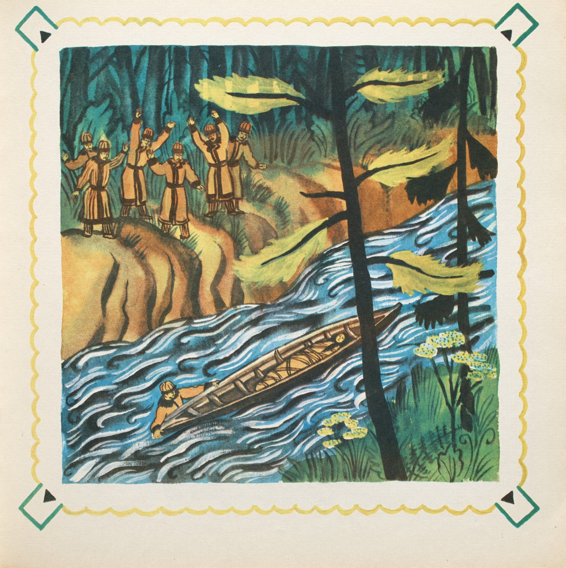 This collection of Altai tales was illustrated by Viktor Duvidov (1932–2000), a Spanish-born graphic artist, painter, and illustrator. Duvidov's parents were Spanish anti-fascists who died during the Spanish Civil War. In 1936, he was brought to the USSR and raised by a family of Moscow doctors. He studied at the Moscow Polygraphic Institute and, alongside his friend May Miturich, contributed to the design of the Moscow Paleontological Museum. Tragically, Duvidov was killed under mysterious circumstances in his apartment at the age of 67.