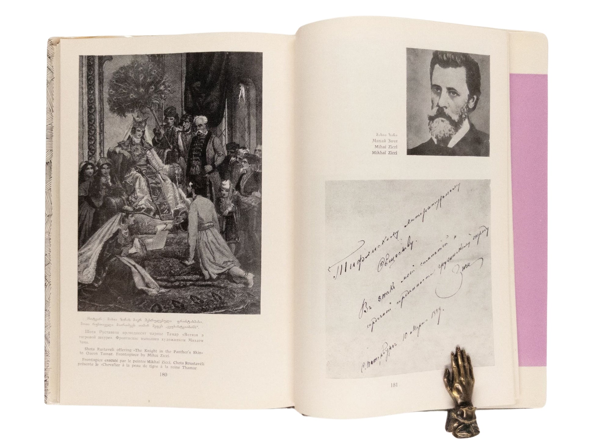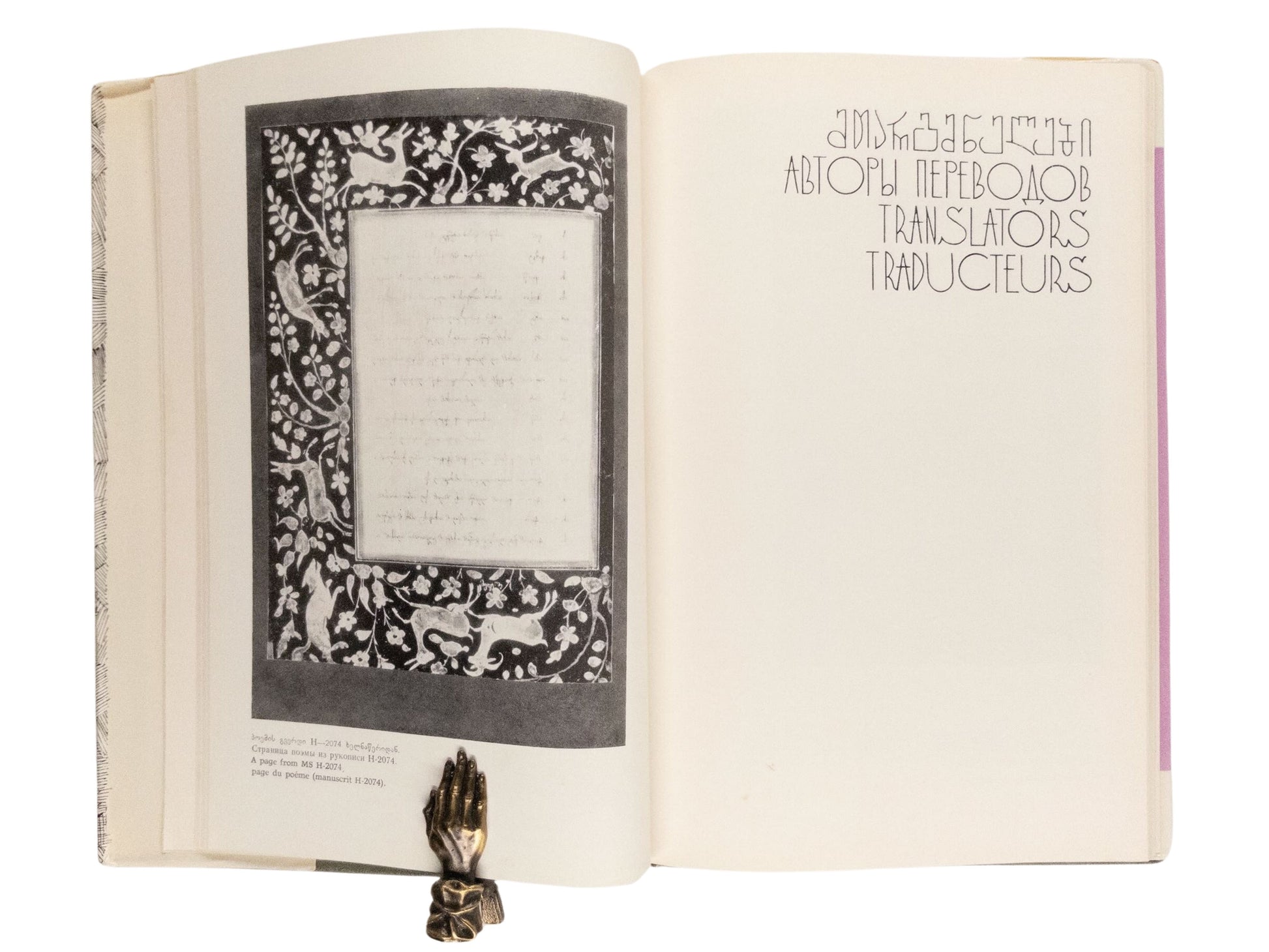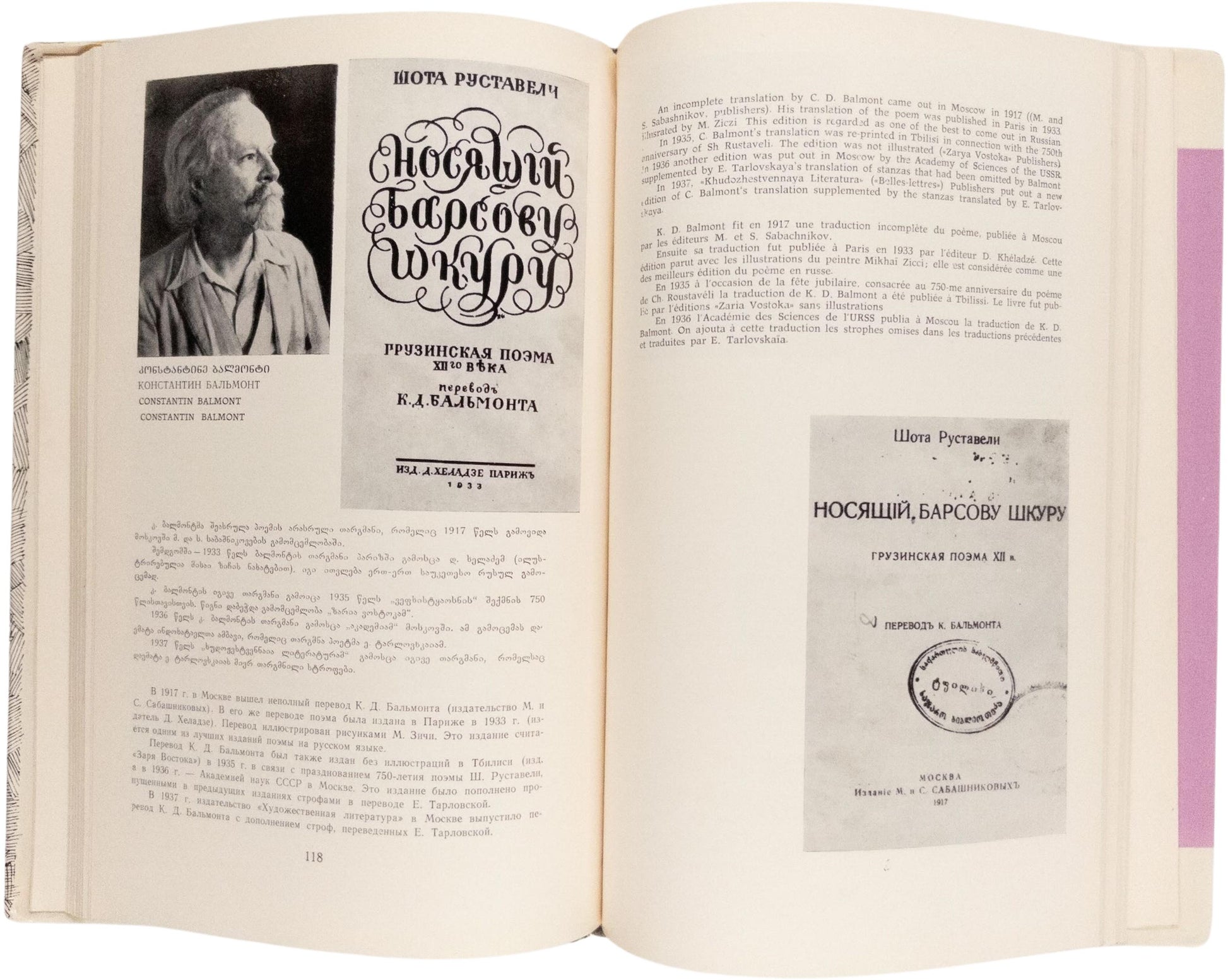 This distinctive edition offers comprehensive bibliographic research, adorned with illustrations, encompassing foreign and even emigrant editions of Shota Rustaveli's masterpiece. Within the reference book, detailed information about the translators is contained, accompanied by their portraits and images of title pages. The second segment of the book presents black and white illustrations, primarily crafted by Georgian artists, from different editions of this renowned poem.