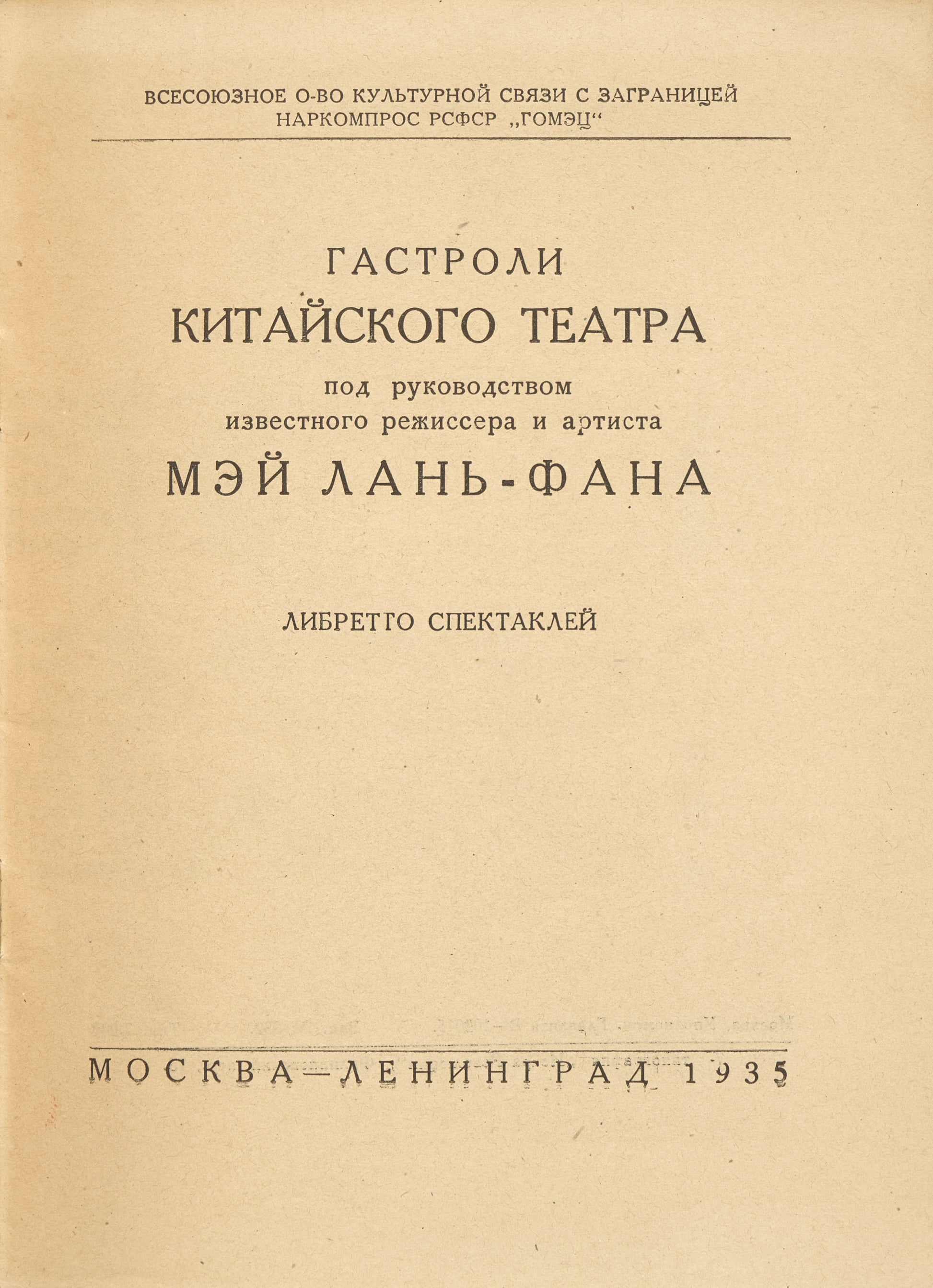 The tour was organized by the All-Union Society for Cultural Relations with Foreign Countries (VOKS). The troupe arrived on March 12 and staged performances for six days in the Moscow Concert Hall, followed by eight days in Leningrad (where Stalin himself attended one of the performances). The tour concluded on April 13 at the Bolshoi Theater in Moscow. 'From the point of view of Soviet domestic policy, this invitation could hardly be more paradoxical: The Kremlin officially inviting and indeed welcoming, a cultural and artistic exchange with the most seductive representative of a manifestly theatrical and feudal stage tradition with men practicing cross-dressing in all female parts! In Soviet everyday life in 1935, such a guest appearance would seem puzzlingly politically incorrect: Stalin defying his own new state art doctrine of socialist realism?' (Risum, Janne The Foreign-Policy Aspect of Mei Lanfang’s Soviet Tour in 1935 // Nordic Theatre Studies. Vol. 31. No. 2. 2019. P. 91).