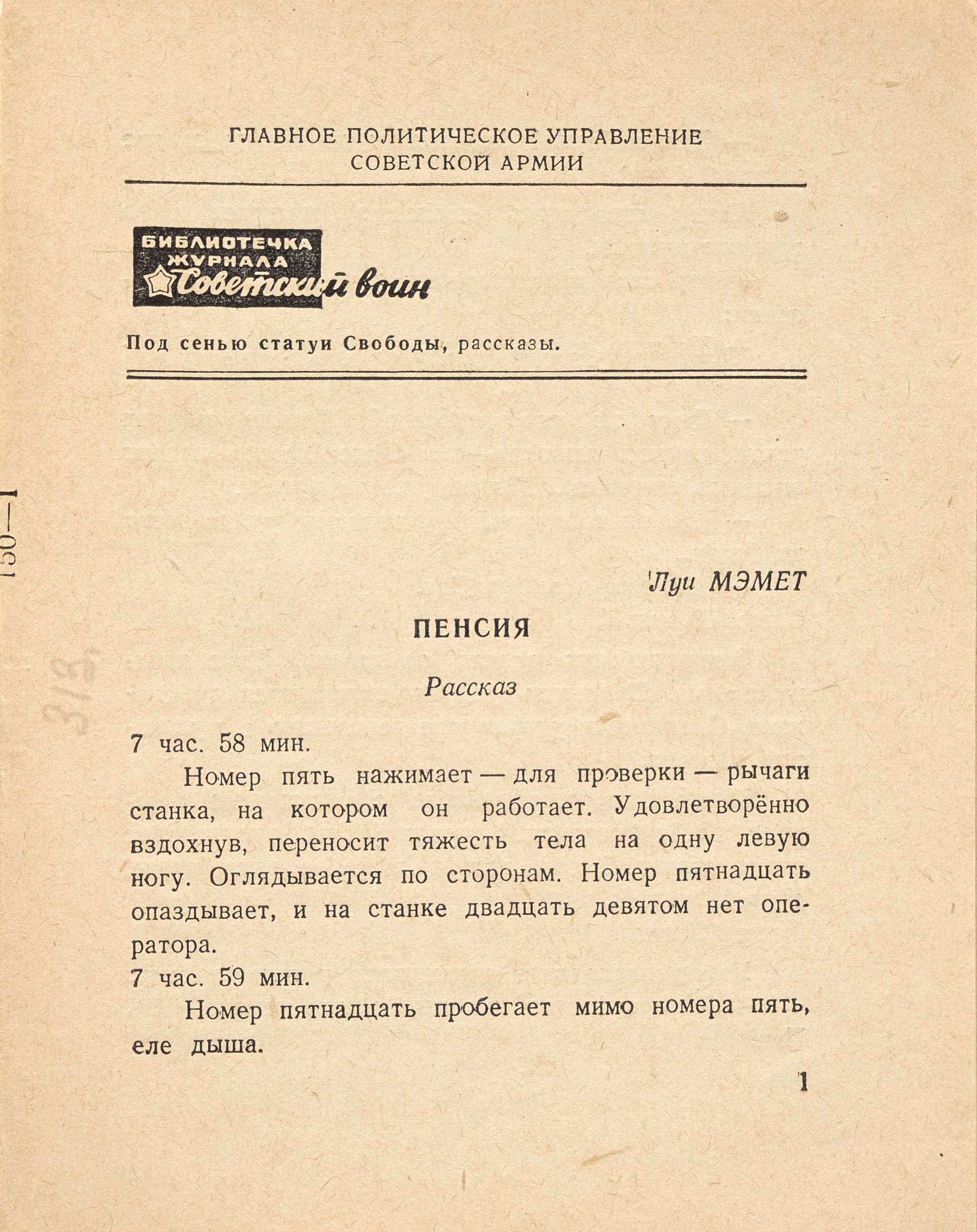 This series of books from the magazine 'Sovetskii voin' comprises Russian translations of stories by American authors, published by Voenizdat (the Russian Military Publishing House) during the Cold War. These collections include stories not only by leftist or communist writers but also by politically neutral authors. In this case, each story was accompanied by a special preface aimed at providing the correct interpretation of the texts. The series began publishing in the 1940s and continued until the dissolution of the USSR.