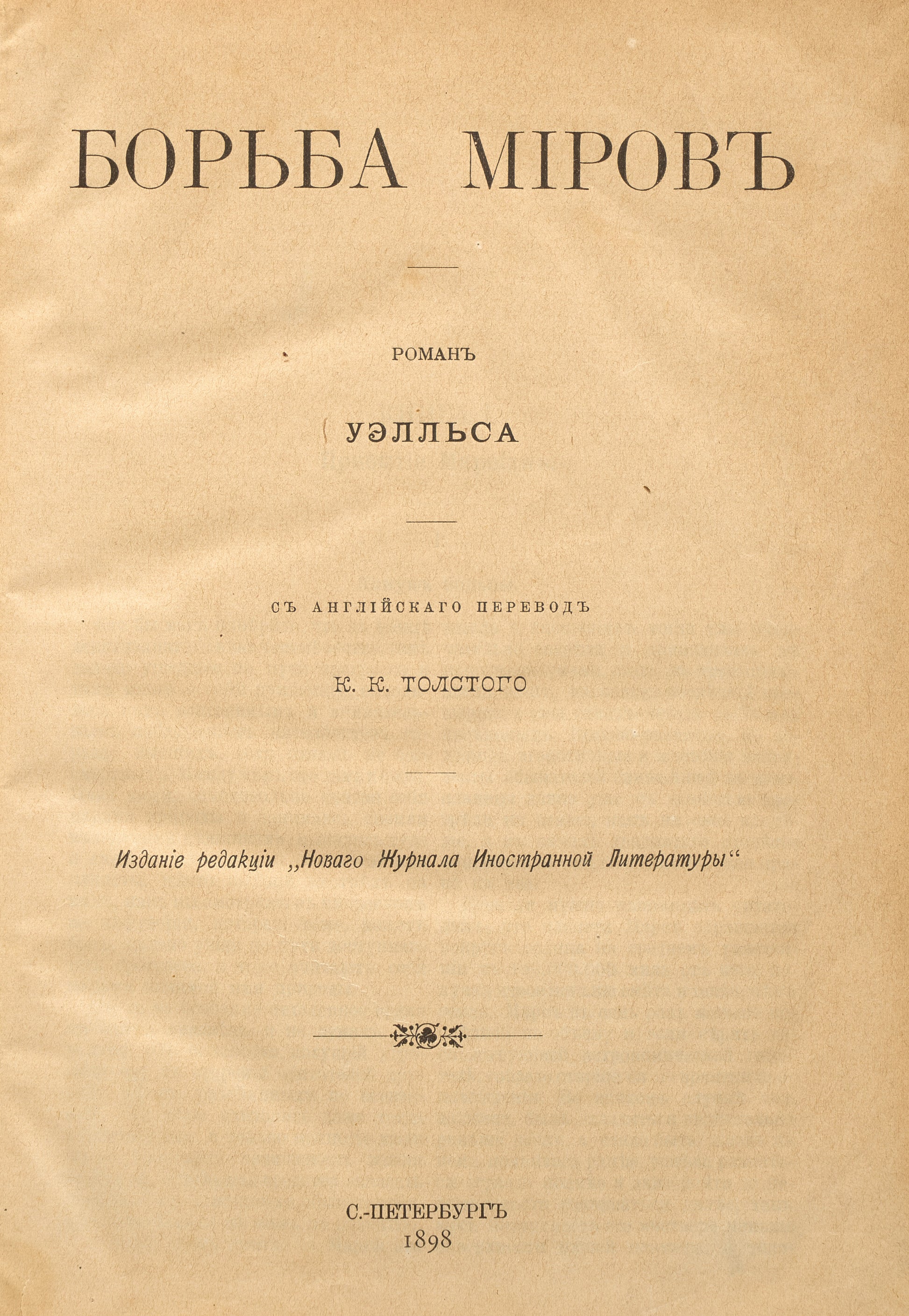 This Russian translation was issued in the same year as the first edition of 'The War of the Worlds' was published. The translation appeared in the magazine 'Novyi Zhurnal Inostrannoi Literatury, Iskusstva i Nauki' ('New Journal of Foreign Literature, Art, and Science', Nos. 6-9), and this particular copy is an offprint from the magazine. It was also published in 1898 as a separate book in a smaller format with different pagination.
