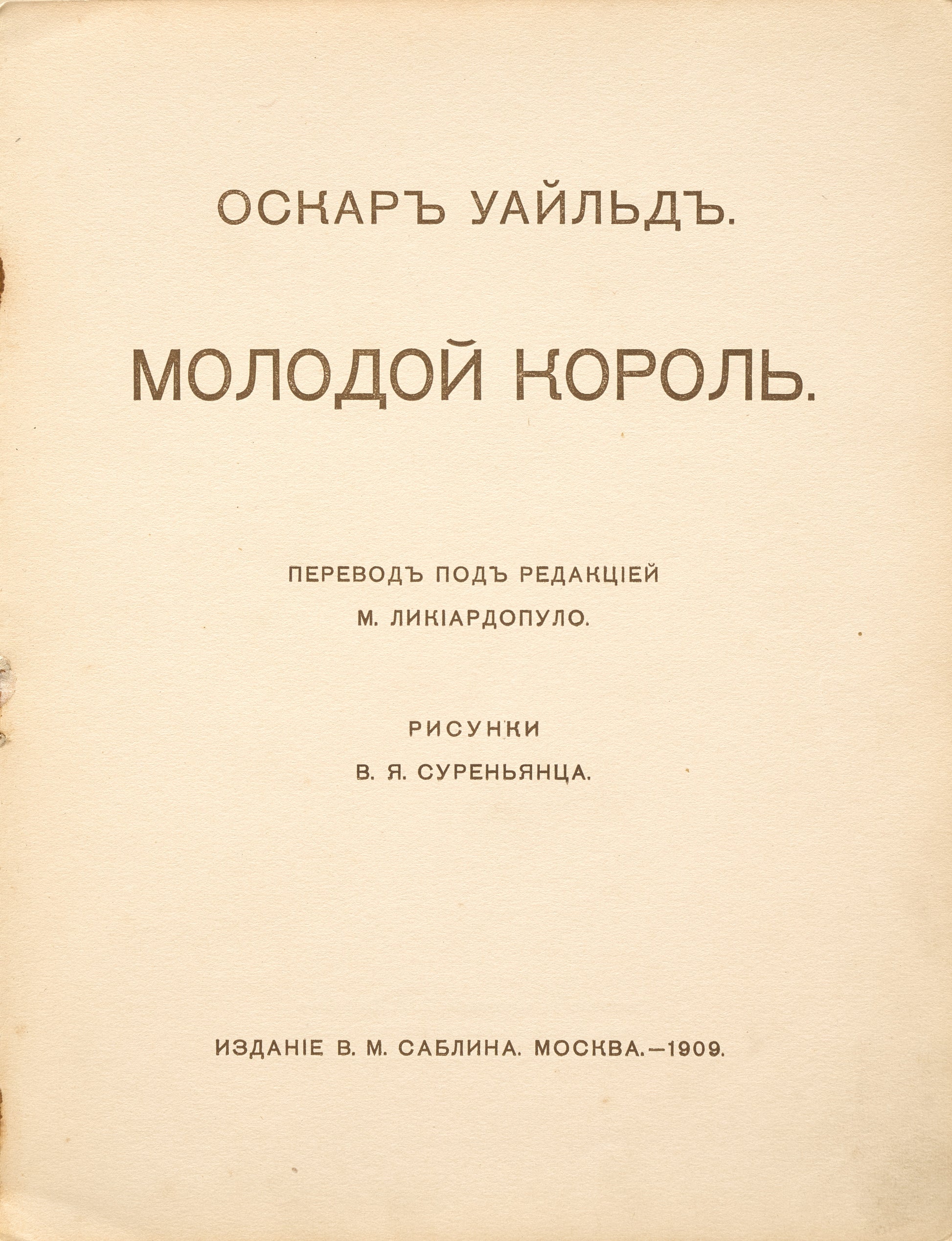 The translation was prepared by Wilde’s foremost translator Mikhail Likiardopulo (Popandopulo; 1883–1925), a journalist and secretary of the symbolist magazine 'Vesy'. Likiardopulo produced fine translations of almost all of Wilde’s works. He was acquainted with Alfred Douglas and Robert Ross, who allowed him to copy Wilde’s 'Florentine Tragedy', a fragment of a never-completed play. Likiardopulo was reputedly a spy for Russia, Greece, and England. In 1919, he emigrated to Great Britain, and his translations ceased to be published in Russia.